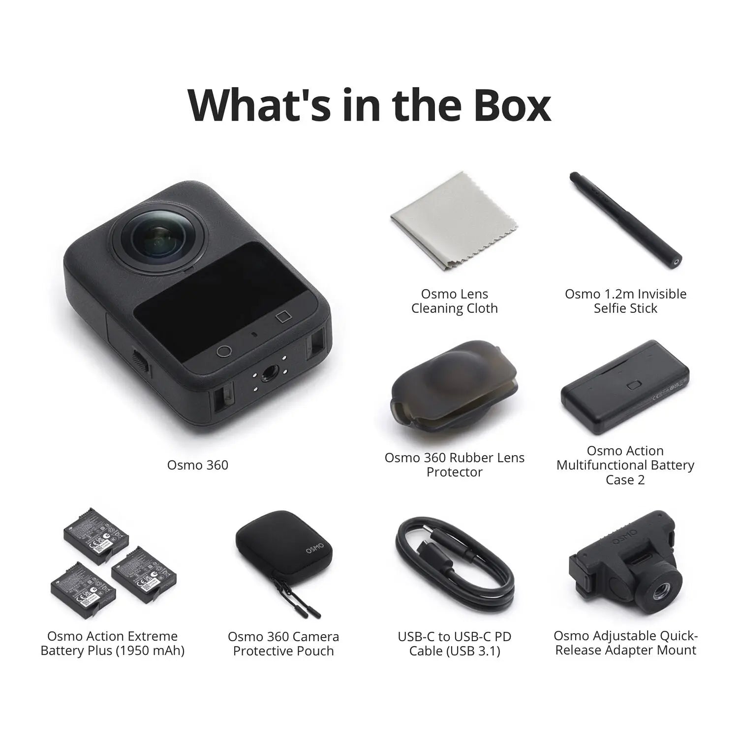 The DJI Osmo 360 Adventure Combo is a comprehensive content creation kit designed for immersive 360° capture in demanding environments. Building on the core power of the Osmo 360 camera, the Adventure Combo adds critical accessories including extra batteries, a multifunctional charging case, and a telescopic selfie stick—perfect for travelers, outdoor creators, VR storytellers, and pros who need extended run time and mounting versatility.