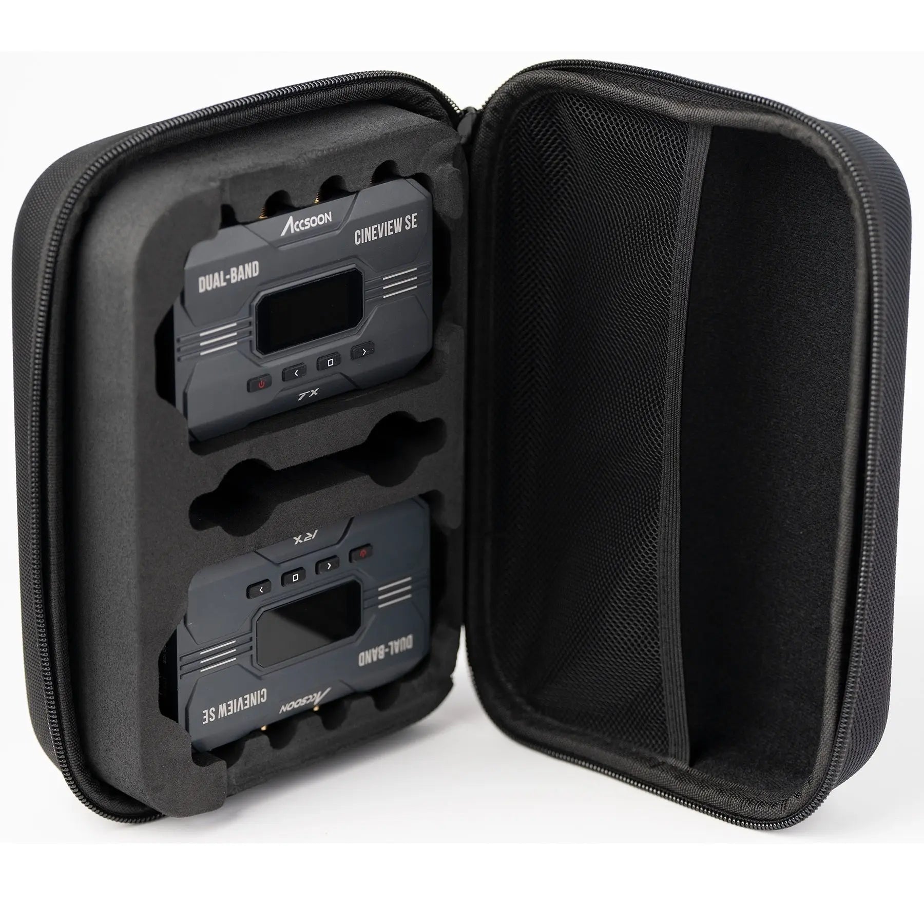 The Accsoon Soft Case for CineView HE, Quad and SE fits one transmitter and one receiver as well as hot shoe adaptors and antennas.