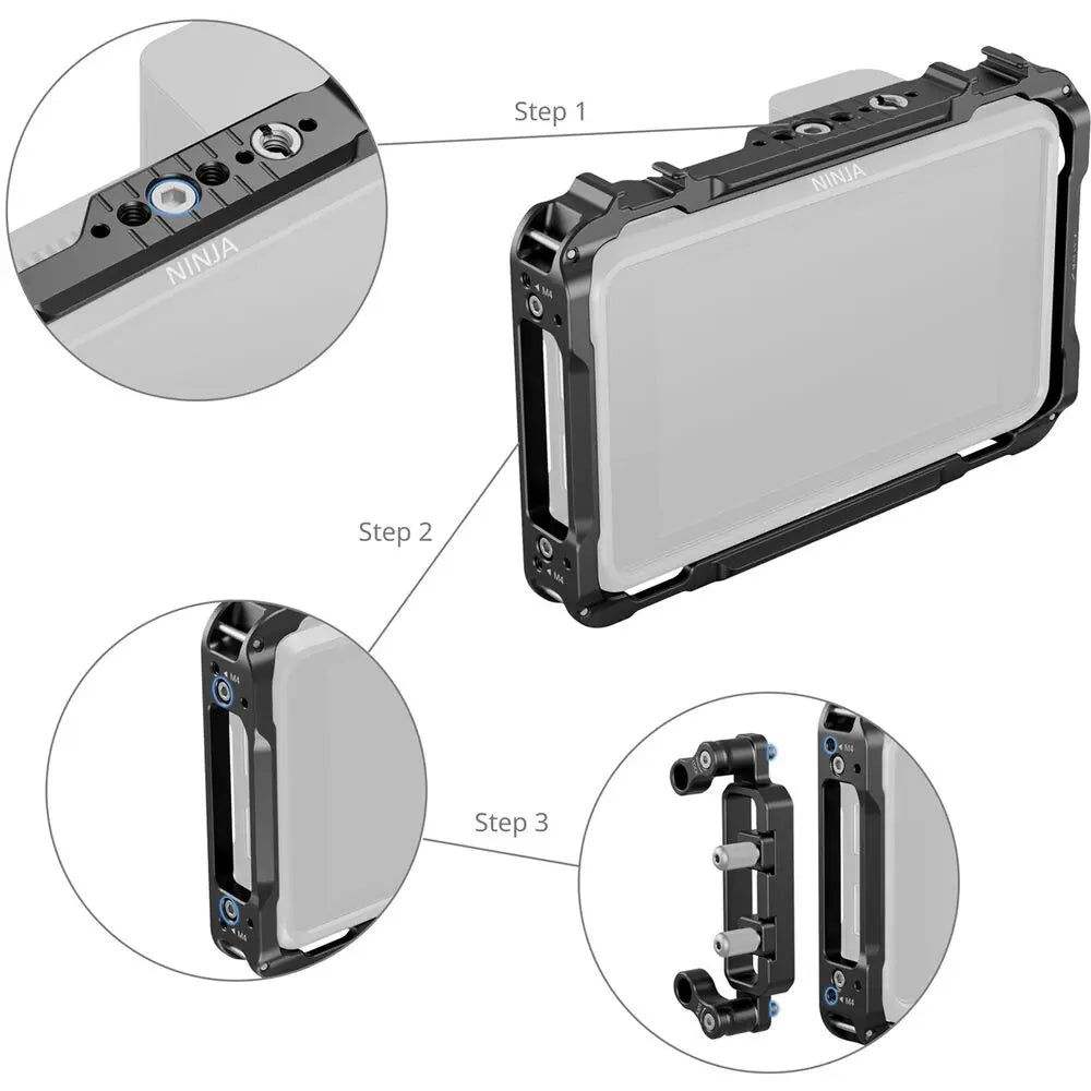 Compatible with the Ninja series sun hood, this cage also features strap slots for attaching a neck strap, ideal for mobile or handheld monitoring setups. Please note that the sun hood must be installed before fitting the monitor into the cage.