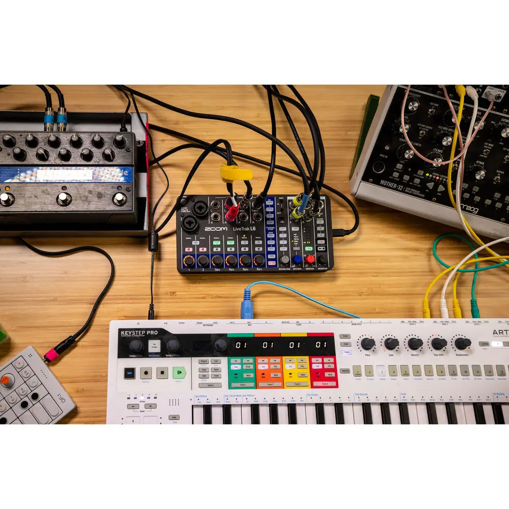 Perfect for keyboard and synth setups, the Zoom LiveTrak L-6 is a compact, battery-powered digital mixer and multitrack recorder designed to get you recording quickly and easily. With intuitive controls, flexible input options, and powerful features, the L-6 is ideal for live performance, home studio use, or on-the-go music production.Record directly to an SD card, stream via USB to your computer or iOS device—or do both at once. The L-6 supports up to 10 inputs with 6-channel simultaneous multitrack recording.