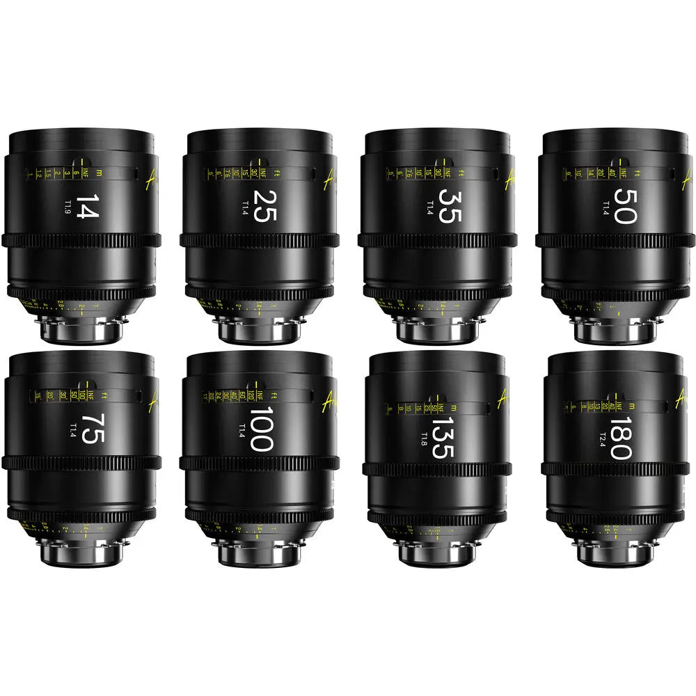 This DZOFilm Arles FF/VV 8-Lens 14/25/35/50/75/100/135/180mm Kit (PL Mount, Feet) includes eight focal lengths spanning a comprehensive range from wide to telephoto. This ARRI PL, vista-vision full-frame compatible set comprises 14, 25, 35, 50, 75, 100, 135, and 180mm lenses plus a lens case. All the lenses share similar gearing, iris blades, front diameters, and aperture ranges for easy switching. See below for more information on the individual lenses included in this kit.