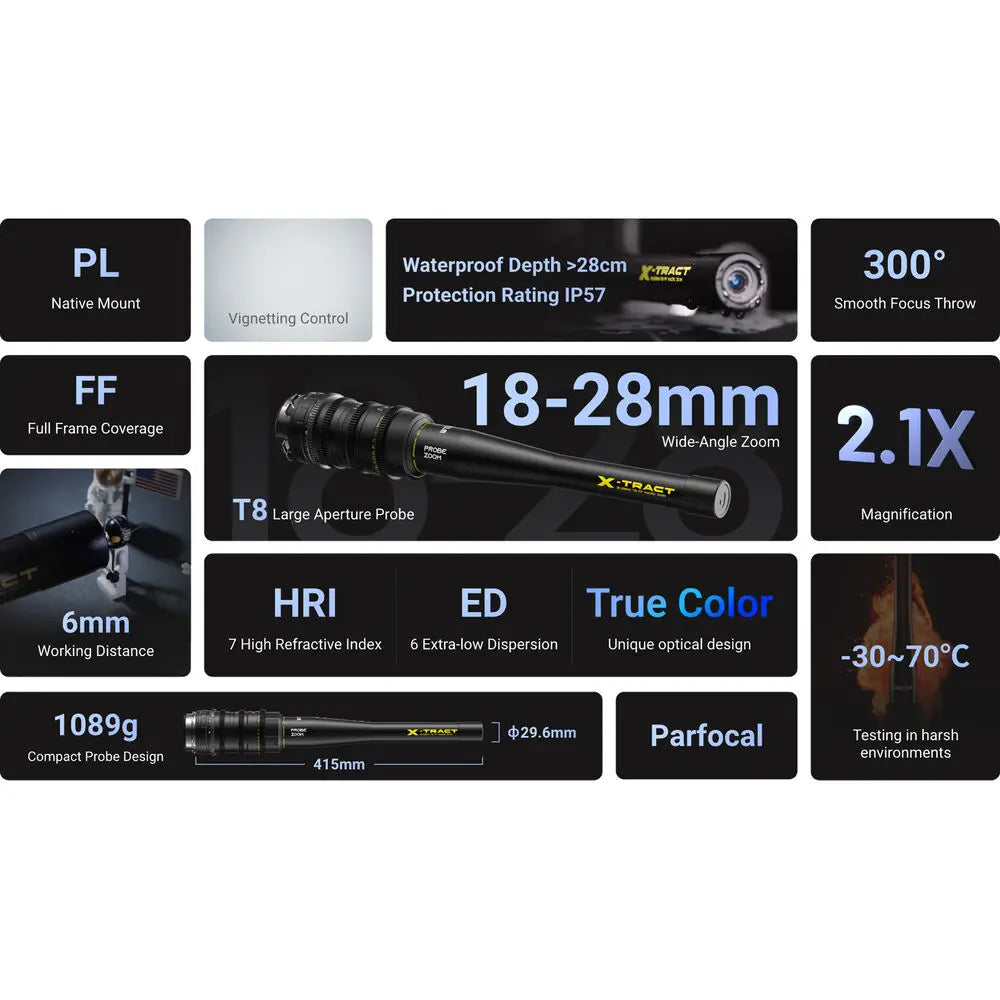 Unlock unmatched creative freedom with the DZOFilm X-Tract 18-28mm T8 FF Probe Zoom Lens Kit, designed for ARRI PL-mount cinema cameras. This innovative full-frame probe system includes interchangeable 0°, 90°, and 360° tube modules, offering unparalleled versatility for macro and close-up shooting in commercial, tabletop, and narrative productions. Measuring just 41.4 cm in length with a slender <30 mm front diameter, this lightweight, compact lens is ideal for navigating tight spaces or unconventional angles.