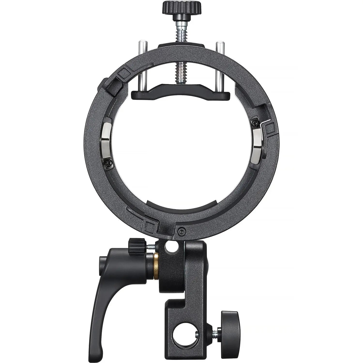The S3 is also designed with practical mounting options for studio and location use. An integrated umbrella mount allows for quick installation of umbrellas, providing an additional lighting control option. At the base, a standard light stand mount enables secure attachment to most light stands, making the bracket a reliable and adaptable component of any lighting setup.