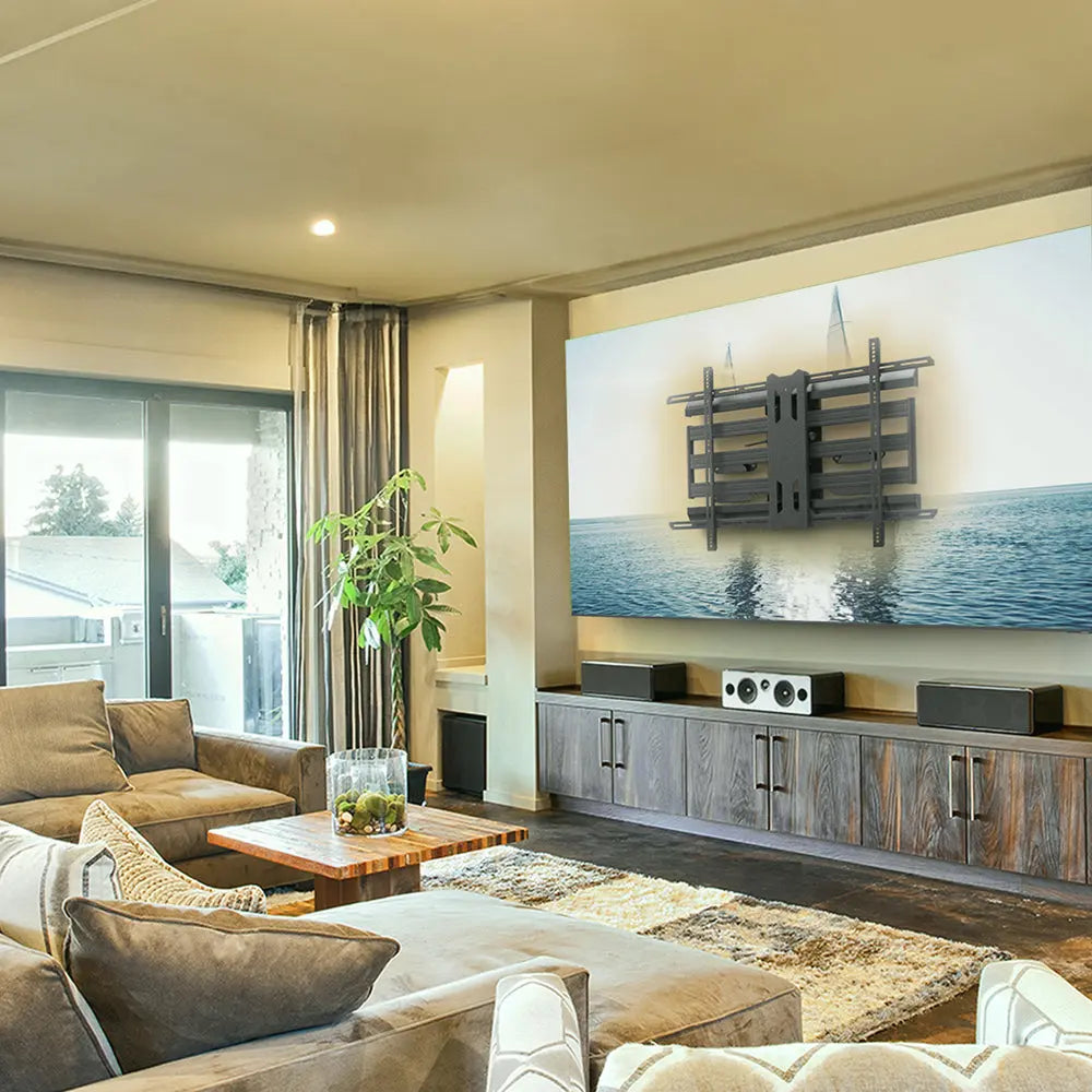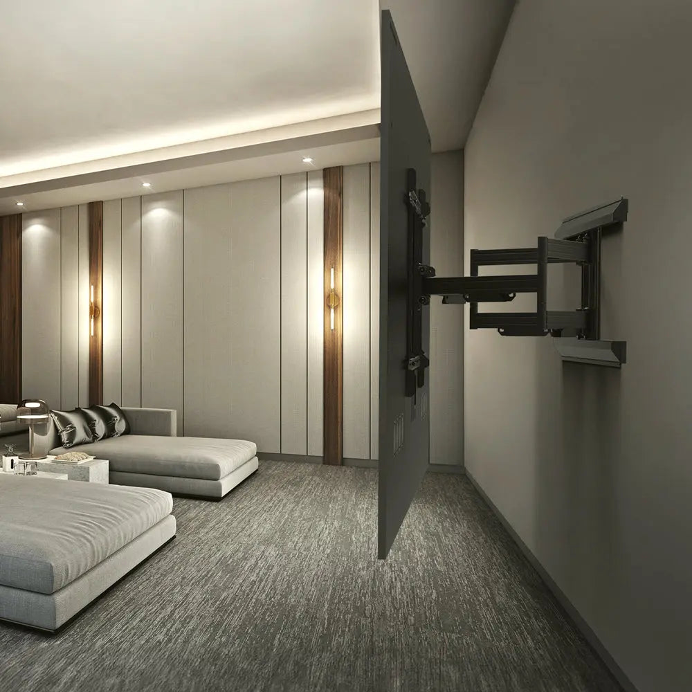 Kanto PMX800 Pro Series Full Motion TV Wall Mount with Adjustable Offset for 55" - 120" TVs - Kanto PMX800 PRO. Full Motion TV Wall Mount for Extra-Large Screens. Don't let the size of your TV limit where you place it. The PMX800 is designed to support screens up to a massive 120", giving you flexibility to create the perfect setup. With the ability to adjust up to 280 mm (11Ó) horizontally, you can fine-tune the position of your display with ease. An oversized 900 _ 600 VESA interface ensures broad compatibility with extra-large TVs and touchscreens, while also allowing flexible vertical positioning. With an impressive 795 mm (31.3Ó) extension, this heavy-duty mount gives you the swivel range needed to achieve the ideal viewing angle. When fully retracted, the slimline profile keeps your TV just 66 mm (2.6Ó) from the wall for a clean, modern look. Built to last, the PMX800 features all-metal cable management and durable lag bolt covers. Tool-free tilt adjustment makes it simple to fine-tune your viewing angle on the fly.