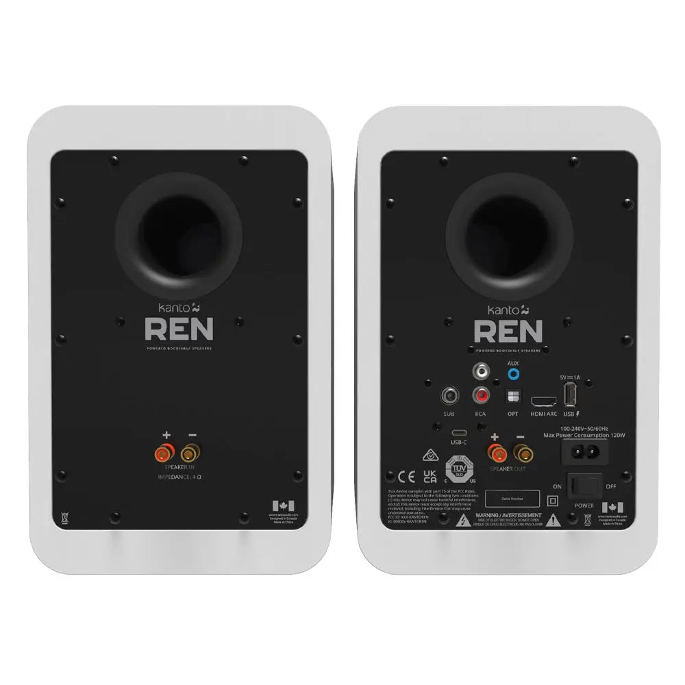 Kanto REN 200W Powered Bookshelf Speakers with HDMI ARC, USB-C, and Bluetooth 5.3 - Matte White, Pair - Blending the simplicity of a soundbar with the precision of a DSP-controlled stereo system, REN seamlessly connects to any modern TV via HDMI ARC, delivering a home theatre experience in a sleek, all-in-one setup. It eliminates the common frustration of muffled dialogue and overpowering sound effects with two specialised modes—enhancing vocals for clarity and reducing bass for late-night viewing. When paired with a subwoofer, REN intelligently filters out sub-bass from its 5.25” aluminium woofers, allowing them to focus on midrange frequencies with minimal distortion. Beyond the living room, REN’s versatility shines with Bluetooth 5.3 for smart home integration, optical input for WiFi streamers, USB-C for desktops, and analog inputs for ultimate compatibility.