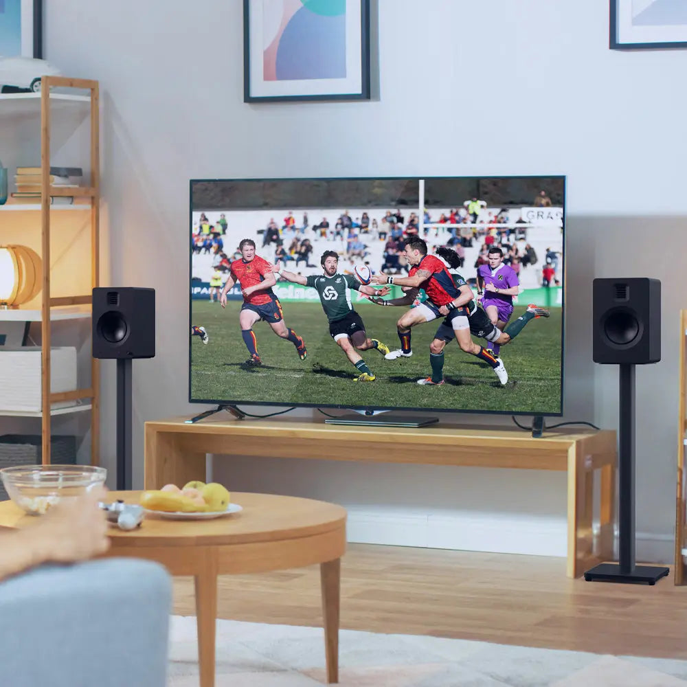 -Neat and Tidy – Built-in cable management lets you run speaker and power cables through the centre column, keeping things neat and trip-free.