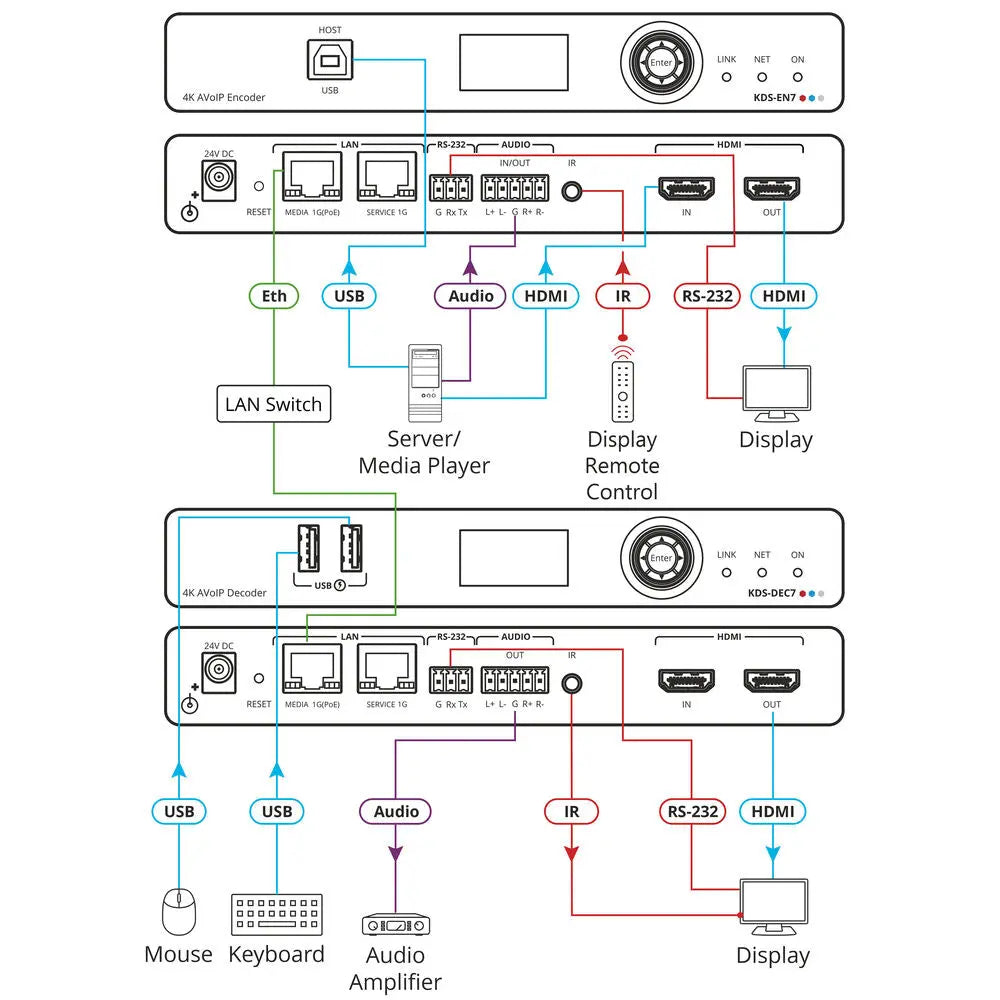 In addition to video, the encoder transmits USB, IR, RS-232, and CEC control signals over the same IP network, ensuring full system integration. With support for instantaneous switching under one second, the KDS-EN7 provides real-time performance for mission-critical applications.