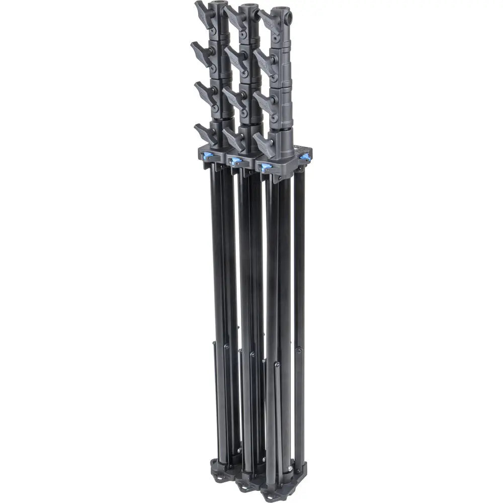 Made of sturdy aluminum, the three-section Kupo 090 Click Stand with Removable Center Column (2.77m) rises to a maximum height of 2.77m with a wide and stable 110cm footprint. Its legs carry a removable center column and fold down flat to interlock multiple stands for easy transport.