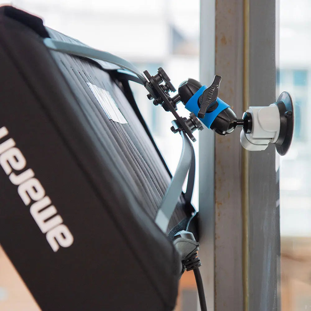 The ball joint attaches to the Amaran spider and allows for angle adjustment, while mounting to a standard 16mm light stand or spigot. It can also be mounted to glass surfaces using the optional Kupo KS-422 suction cup shown in image 4, or the Kupo KS-466 magnet mount shown in image 5.