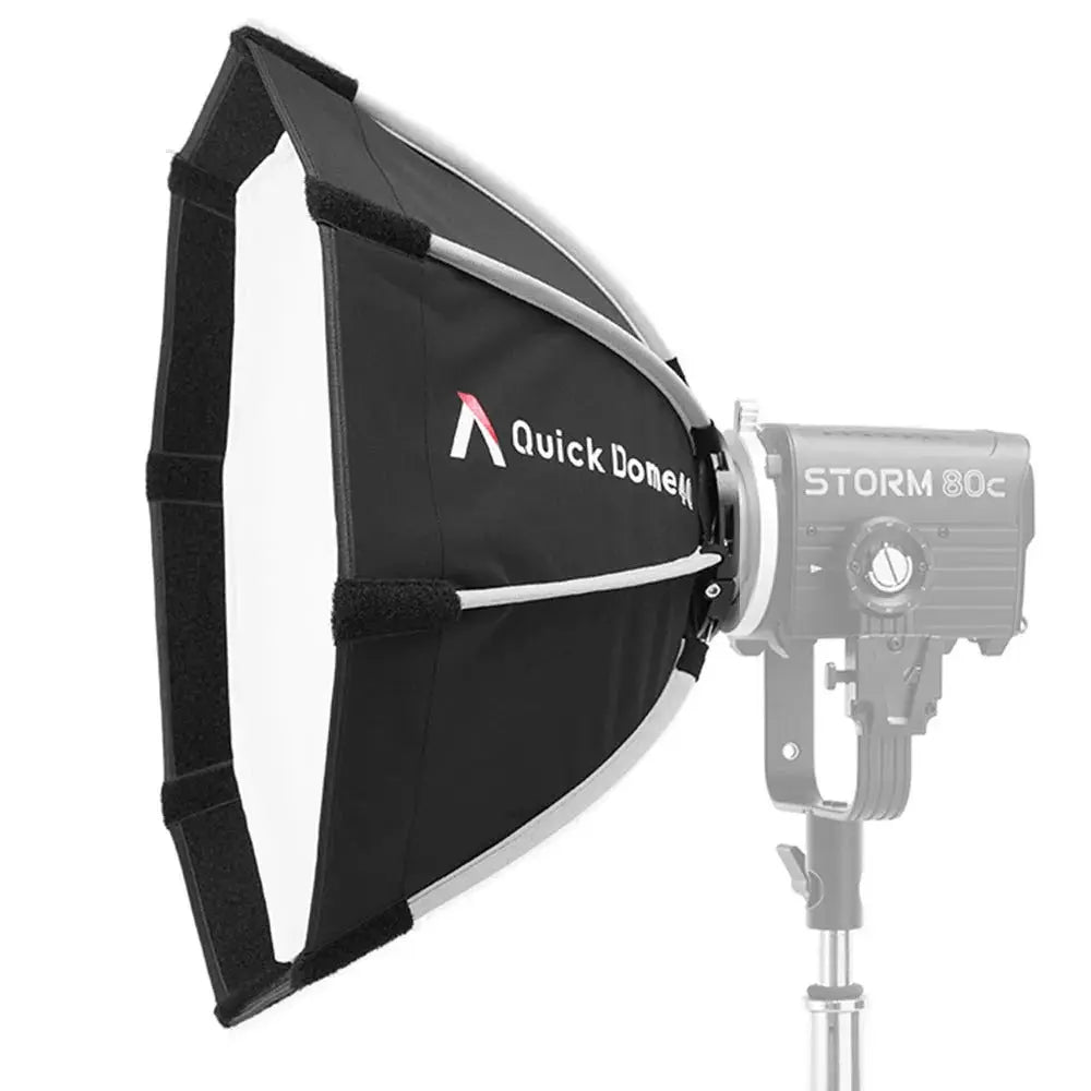 The Aputure Quick Dome 40 is a compact circular softbox featuring a deep parabolic design, specifically crafted to pair with the STORM 80c light fixture. Its highly reflective silver interior ensures optimal light output while producing a soft, even illumination, ideal for diffusing and softening hard point-source lighting.