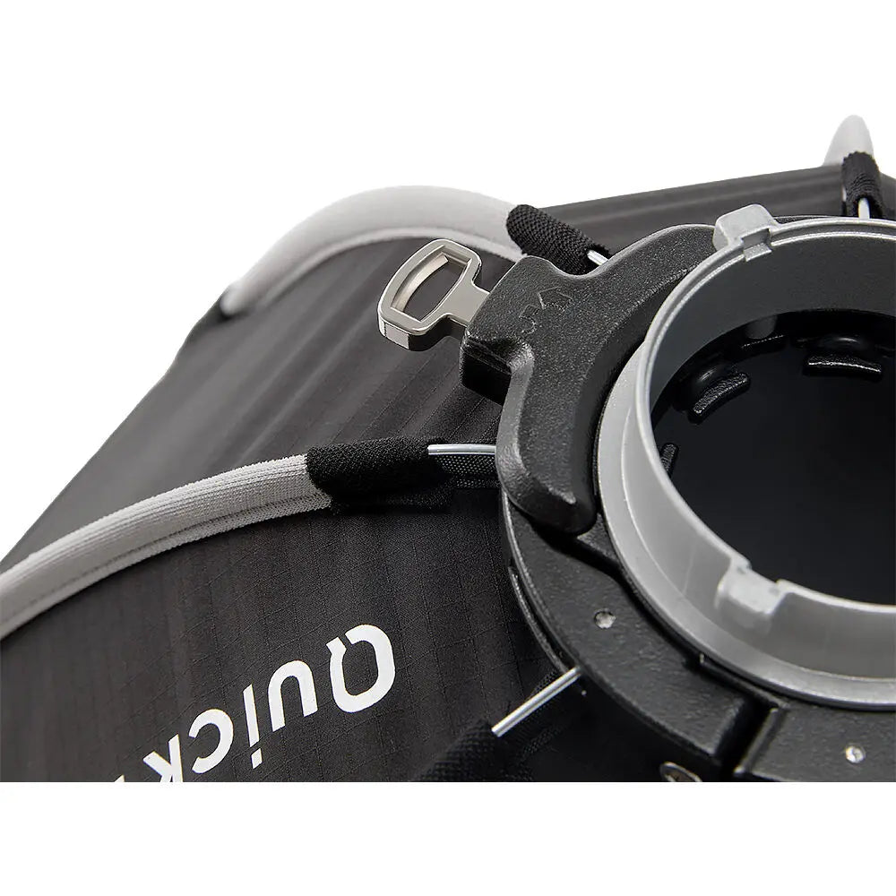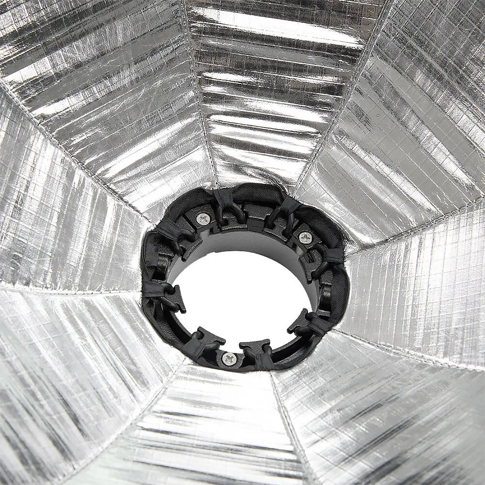The Quick Dome 40 includes 1-stop and 2-stop front diffusion cloths and a 40º fabric light control grid. Its rounded octagonal shape and deep parabolic design guarantee uniform light distribution, while the reflective silver lining maximises output for professional-quality results.