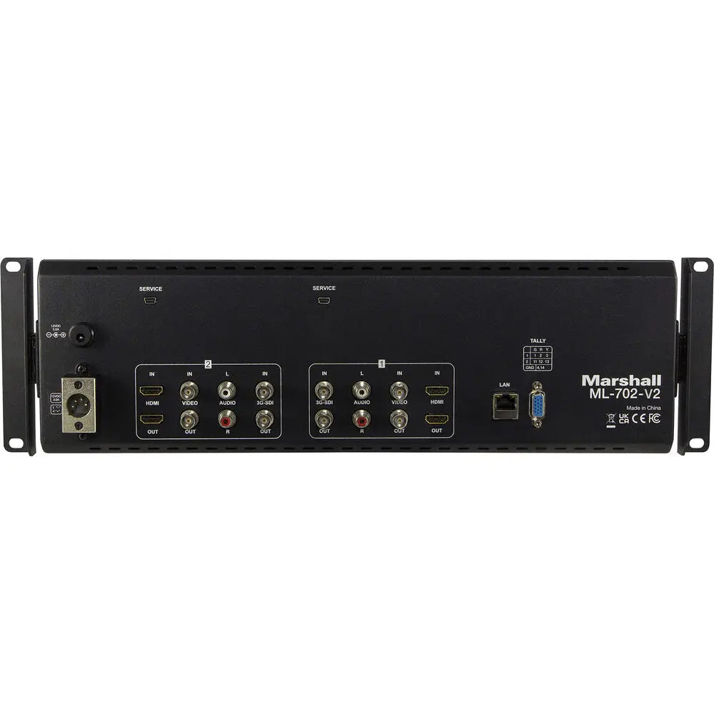 The Marshall Electronics ML-702 V2 is a feature-rich dual 7" LCD rackmount monitor system for professional video environments such as control rooms, routing rooms, studios, and fly packs. Combining performance and versatility, this unit delivers an affordable yet high-quality monitoring solution where space and functionality are key.