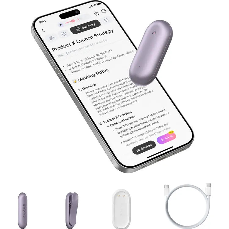 PLAUD NotePin is a wearable AI note-taking device designed to capture conversations hands-free and instantly turn them into searchable transcripts, summaries, and action items. Wear it using the magnetic pin, clip, wristband, or necklace, and start recording with a single press.