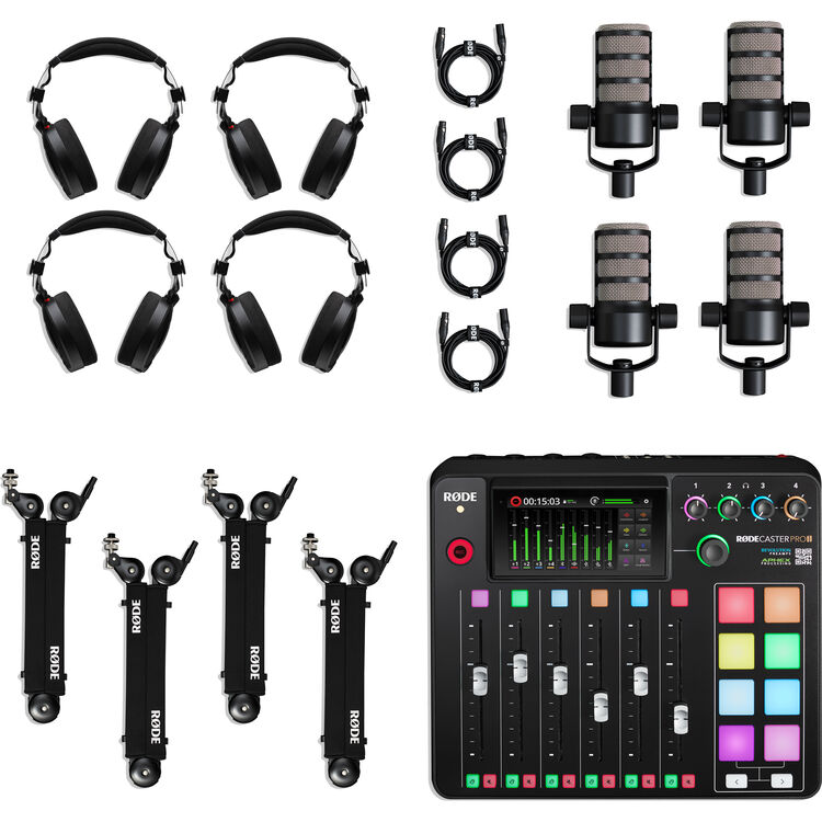 RODE RODECaster Pro II 4-Person Podcasting Kit with PodMics, Studio Boom Arms, Headphones, and Cables