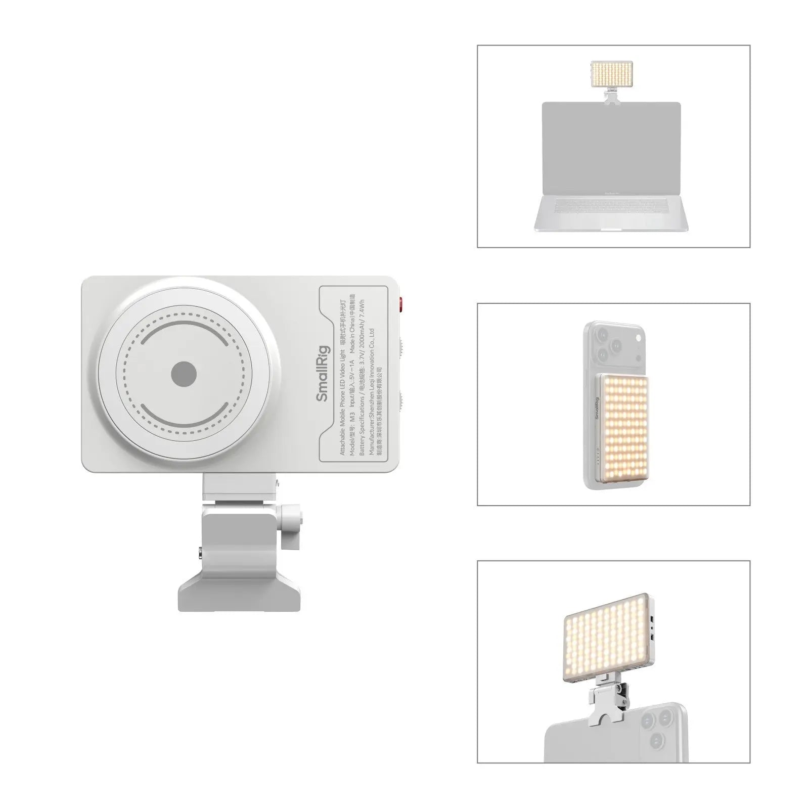 The SmallRig M3 Attachable Mobile Phone LED Video Light (White) 5640 is a versatile, portable lighting solution designed for mobile content creators, photographers, and remote workers. Its MagSafe-compatible design allows instant attachment and detachment to MagSafe-enabled iPhones, while Android devices can be securely mounted using the included metal ring—achieving stable installation in just one second. The clip-on quick release base provides additional flexibility, enabling horizontal or vertical mounting on monitors or laptops with 170° tilt adjustment for precise positioning, all without tools.