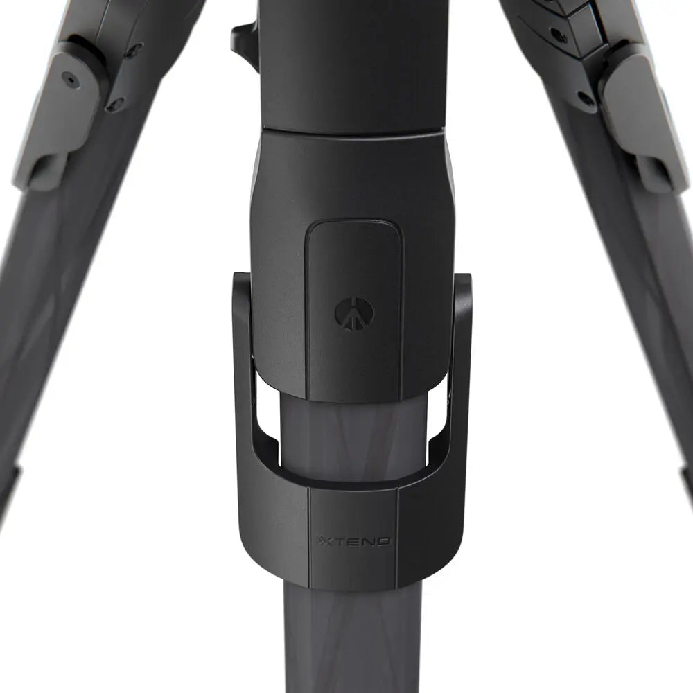 The tripod features a versatile levelling column with a detachable section for low-angle shooting at 19 cm, extending fully to 170.5 cm for elevated or overhead shots. The integrated Q90 mechanism allows the centre column to rotate 90° for overhead and flat-lay photography, while the Easy Link attachment thread provides mounting options for lights, arms, or monitors. The XTEND leg locking system makes setup effortless with a single lever that locks all leg sections simultaneously. Its custom non-rounded legs reduce flex and improve rigidity, and the modular feet allow switching between rubber tips and spikes for stable positioning on any terrain.