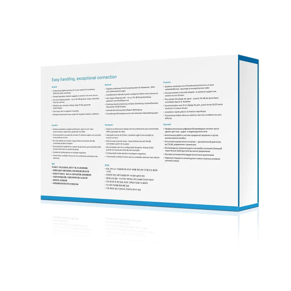 The pro-level capabilities of the EW-DP are simple to set up and use, offering both novice and seasoned users an intuitive user interface. The transmitter can withstand almost any input level you throw at it thanks to its impressive 134 dB dynamic range, so you don't have to worry about adjusting the input gain to avoid clipping. Even in difficult RF conditions, the receiver's wide 56 MHz bandwidth, clever switching diversity reception with two antennas, and auto-scan with 2240 frequencies collaborate to deliver rock-solid wireless performance. Using the Smart Assist app, Bluetooth capabilities let you remotely sync parts and modify settings, while Smart Notifications offer system assistance and troubleshooting. Up to 12 hours of transmitter and 7 hours of reception operation are provided on set via intelligent battery management.