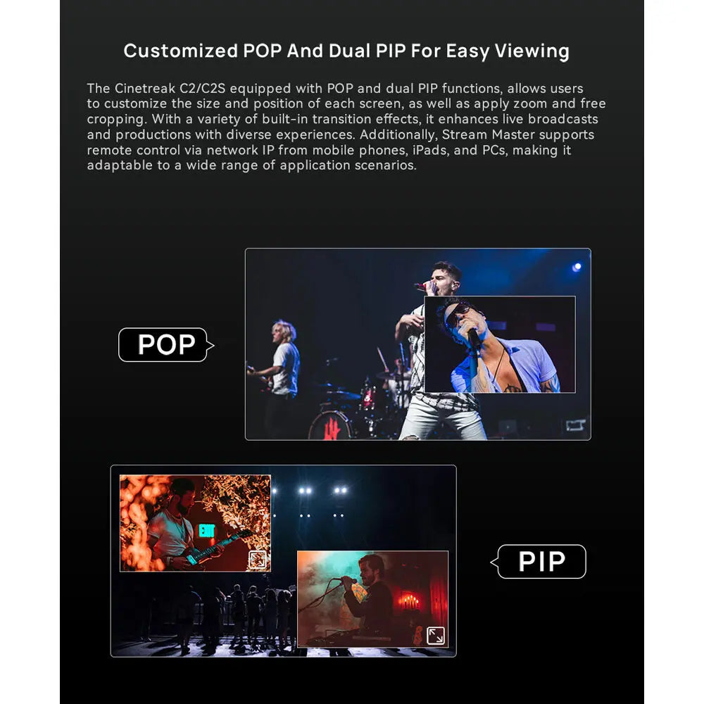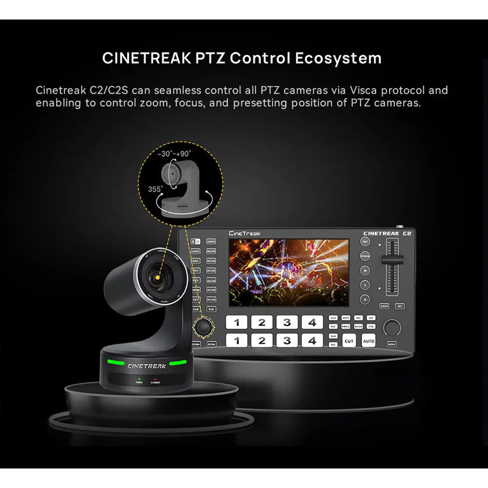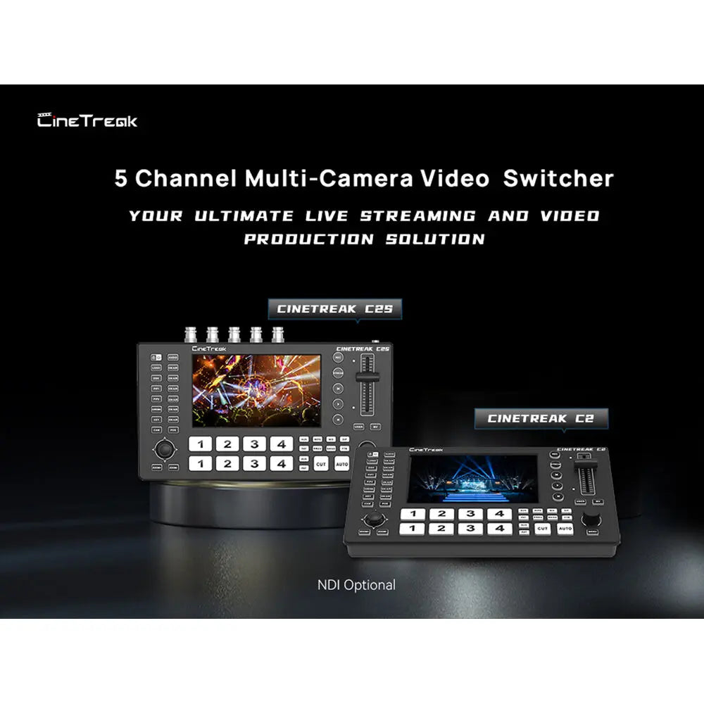 The CineTreak C2S Video Switcher is a professional all-in-one solution for live streaming, multicamera switching, and content creation. Designed for broadcasters, educators, and event producers, the C2S features four HDMI inputs, four SDI inputs, and one HDMI AUX output, providing flexible input options for cameras, media, and graphics. Its downstreaming capabilities allow you to integrate additional content from online streaming sources or directly from an SD card, offering full control over your production workflow.