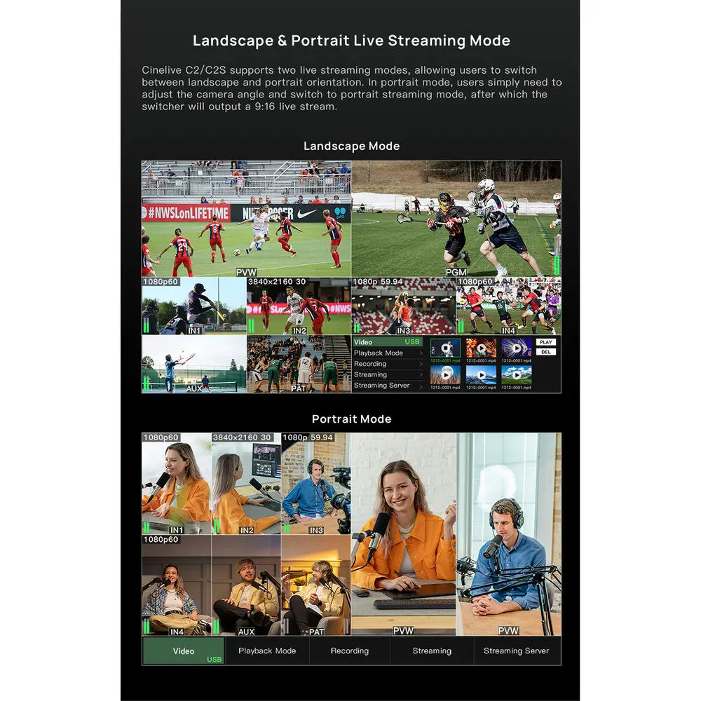 Equipped with a 5.5" LCD screen and a customised Meeting mode, the C2S allows users to display up to four image windows simultaneously, making it perfect for hybrid meetings, webinars, and multi-camera panel discussions. High-bitrate Full HD recording ensures smooth, instantaneous playback, while built-in VISCA PTZ camera control supports up to four cameras. Landscape and portrait modes seamlessly switch between 16:9 and 9:16 aspect ratios to accommodate any display requirement.