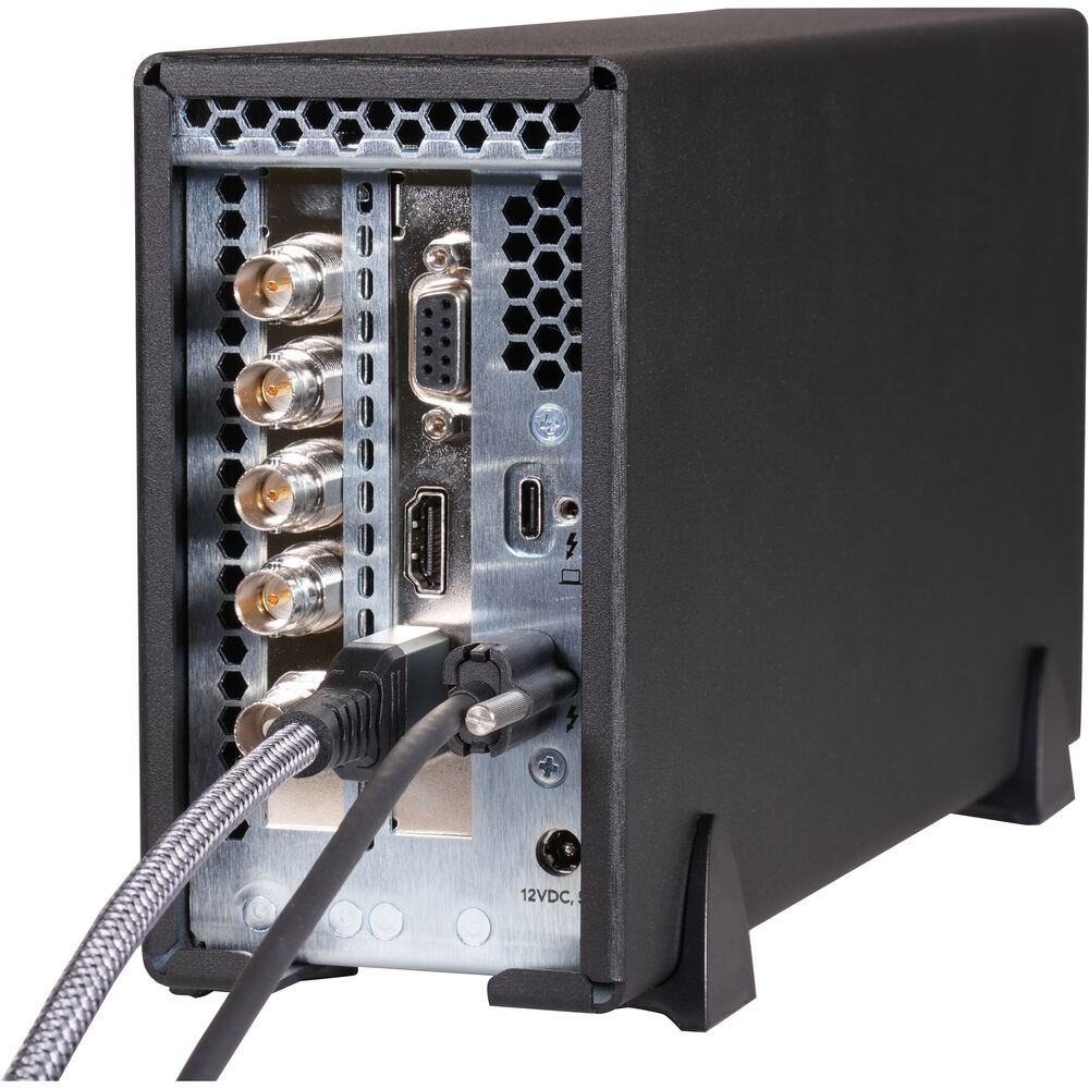 Despite its small footprint, the enclosure is impressively versatile, accommodating single- or double-width cards. When using a single-slot card, you can even add a daughter card for additional connectivity. A built-in 6-pin auxiliary PCIe power connector provides extra power for high-performance cards, including the AJA Kona 5, Blackmagic DeckLink 4K Extreme 12G, and DeckLink 8K Pro G2.