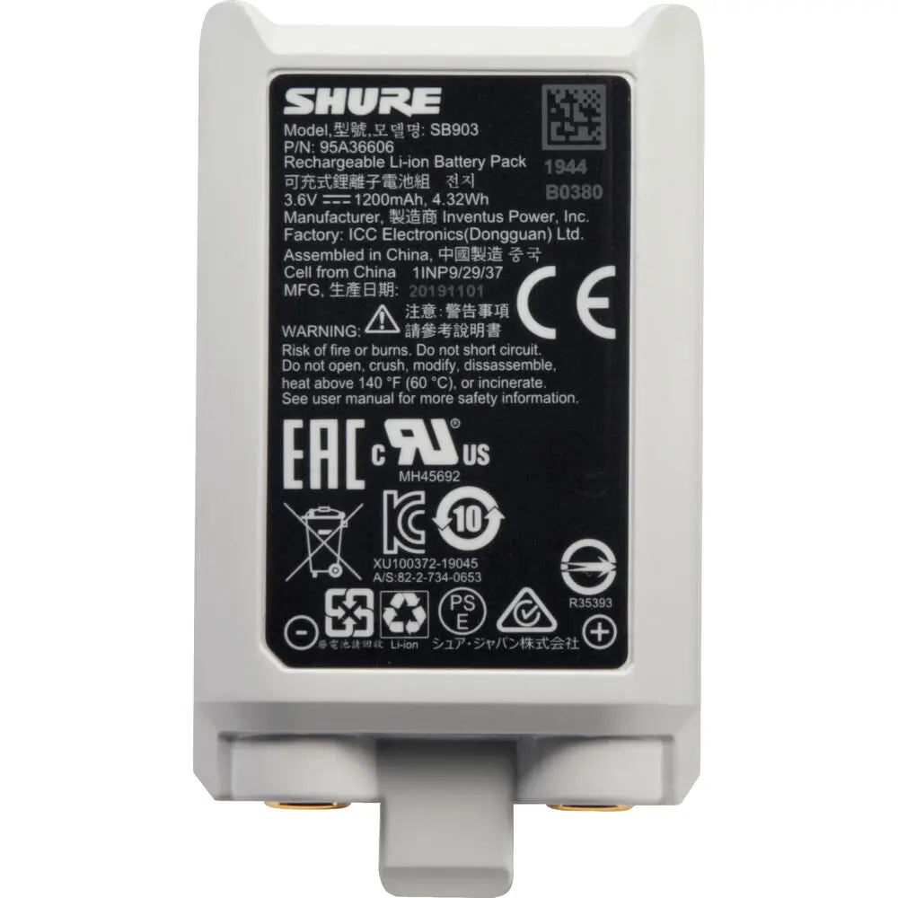 The Shure SB903 is a compact, rechargeable lithium-ion battery designed for reliable performance with Shure wireless systems. Built with a durable molded polycarbonate housing, it delivers up to 8 hours of continuous operation on a single charge. With a capacity of 1200 mAh and efficient recharging capability, the SB903 provides dependable power in a lightweight, travel-friendly form factor—ideal for stage, studio, and broadcast use.