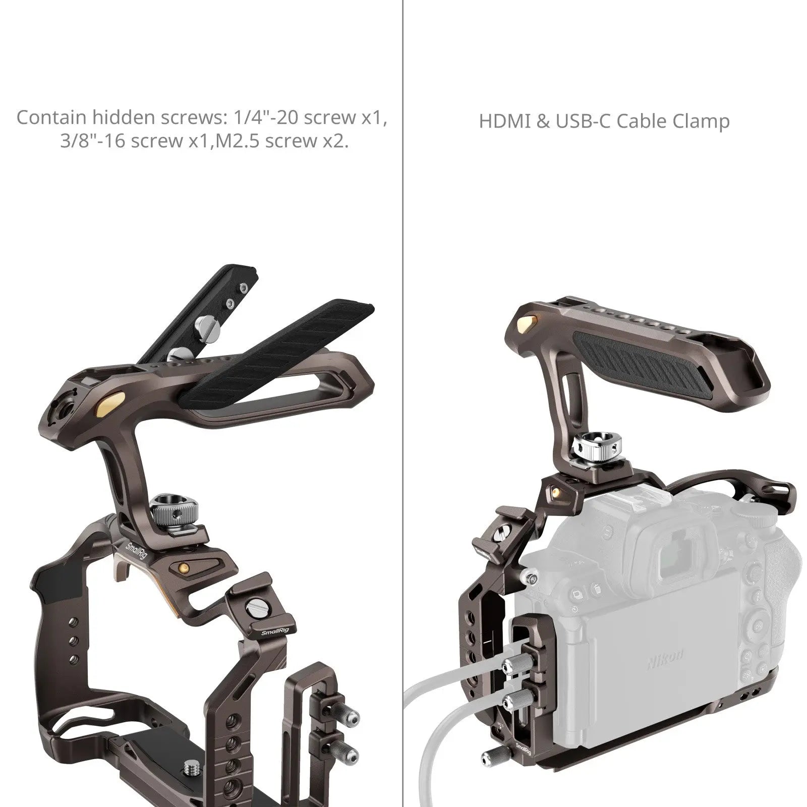 The SmallRig 5259 “Night Eagle” Cage Kit is a premium, all-in-one solution for Nikon Z series creators. Designed with an elegant curved silhouette, gold trim, vintage leather finish, and Nikon’s signature red accent, this professional cage kit includes a detachable cold shoe mount, HDMI & USB-C cable clamp, and an ergonomic top handle for secure, comfortable low-angle shooting.