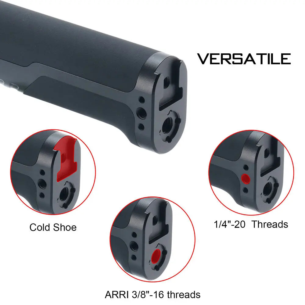 With this Rear Operating Handle from Tilta, you can give your DJI RS 2, RS 3, RS 3 PRO, or RSC 2 gimbal a second handle. The 1/4"-20 screw attaches the aluminium and stainless steel handle to the DJI RS 2 gimbal's back. This handle enables you to hold the gimbal with two hands in addition to the battery grip. Additionally, the handle has numerous 1/4"-20 and 3/8"-16 threads and a shoe mount for attaching extras to the gimbal.