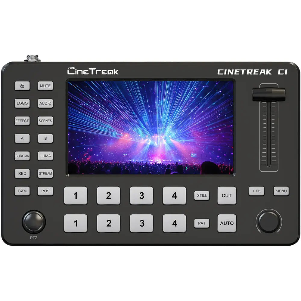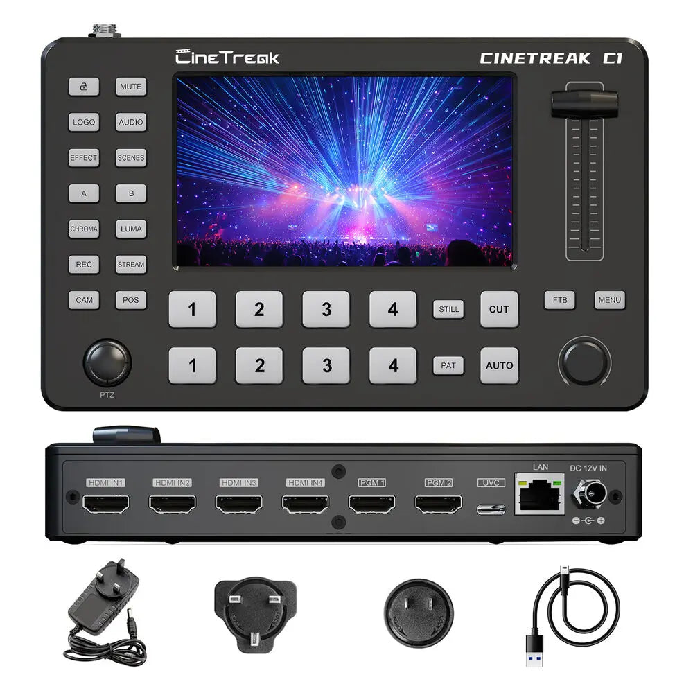 The CineLive C1 Compact 4-Channel HDMI Switcher from CineTreak is a professional, portable solution for mixing and live streaming up to 1080p60 video with embedded audio. Designed for sports, houses of worship, virtual studios, gaming, meetings, and telemedicine, the C1 offers four HDMI inputs, two HDMI program outputs, one USB-C UVC output, one LAN port, and two 3.5mm audio inputs. External recording is supported via USB-A or SSD storage, making it easy to capture high-quality program output for playback or archiving.