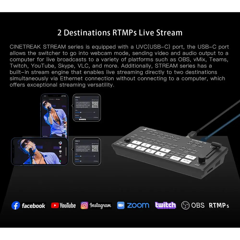 The CineTreak STREAM 1 Video Switcher is a professional all-in-one solution designed for content creators, broadcasters, and live event producers who need versatile multicamera switching. Supporting up to five sources—four HDMI inputs and one HDMI AUX input—the STREAM 1 enables intuitive live production and streaming with powerful recording and playback capabilities. Downstreaming functionality allows additional content to be integrated from online streaming sources or directly from an SD card.