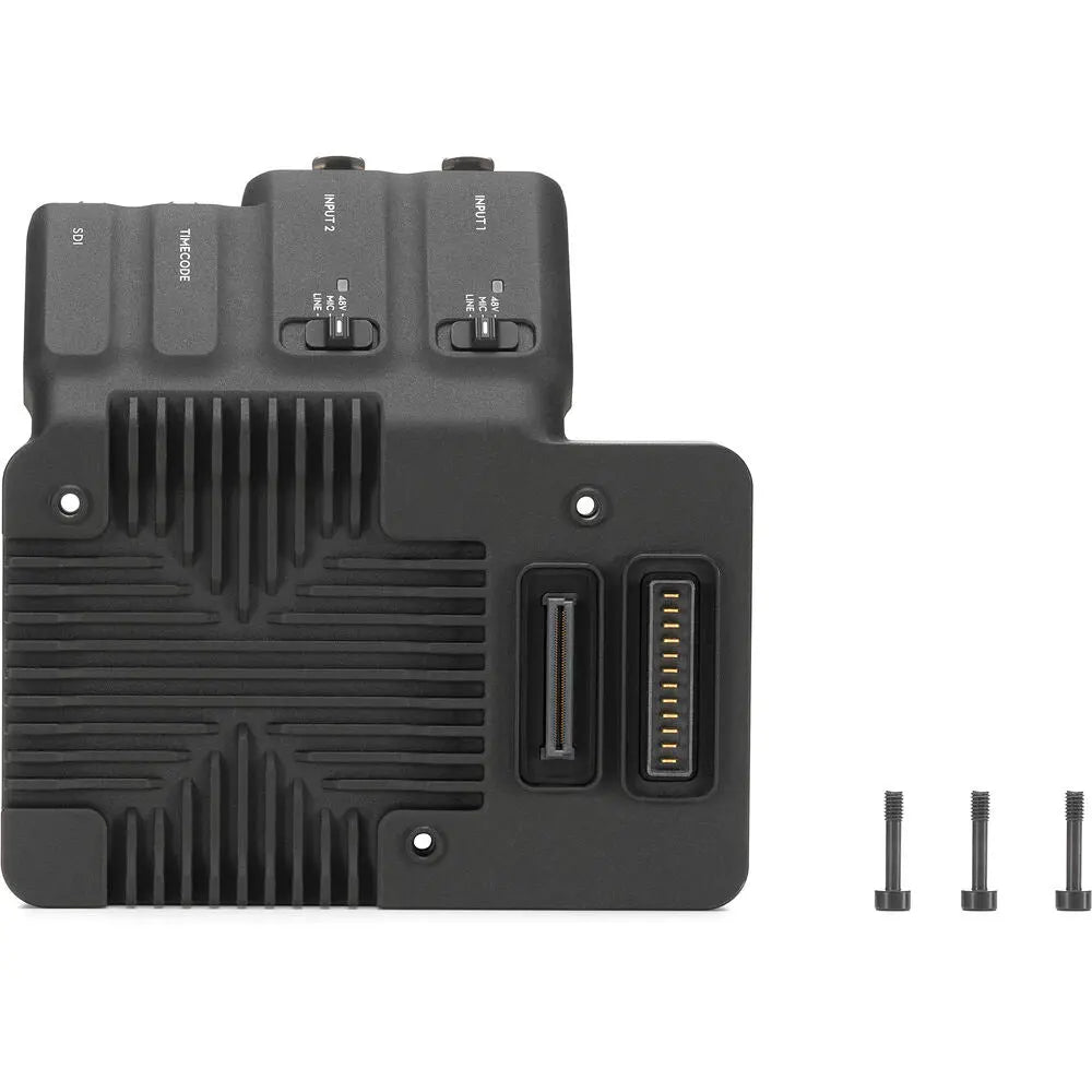 The DJI Ronin 4D Expansion Plate enhances the connectivity and workflow flexibility of your Ronin 4D 6K or 8K camera system. Designed to integrate seamlessly with the Ronin 4D body, the plate mounts to the rear panel using a proprietary interface and three secure mounting screws. Once installed, it expands the camera’s I/O capabilities with a dedicated SDI output, a BNC port for sharing timecode with external devices such as video transmitters, and dual 3-pin XLR audio inputs.