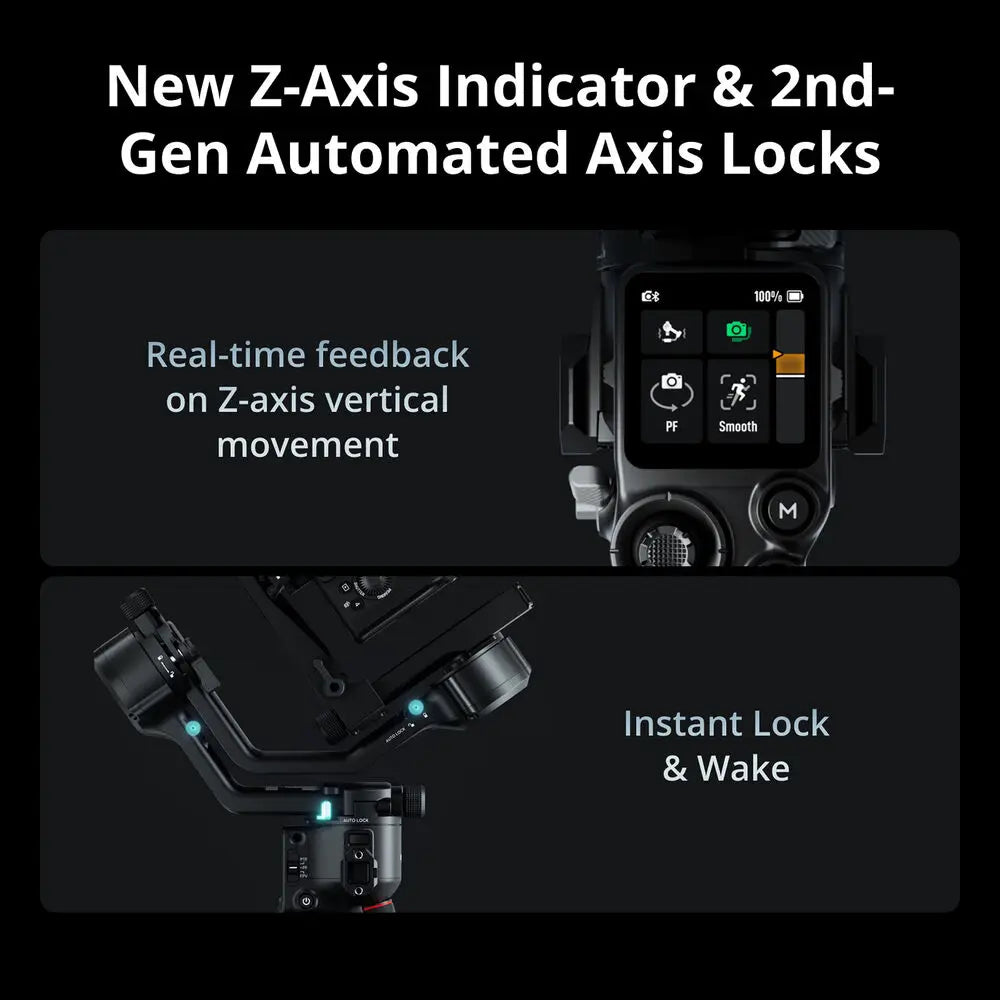 The second-generation automated axis locks improve efficiency and safety during setup and transport. Powering on automatically unlocks all three axes in seconds, while powering off instantly locks the gimbal for storage. Improved locking tolerances reduce unwanted movement and increase overall stability.