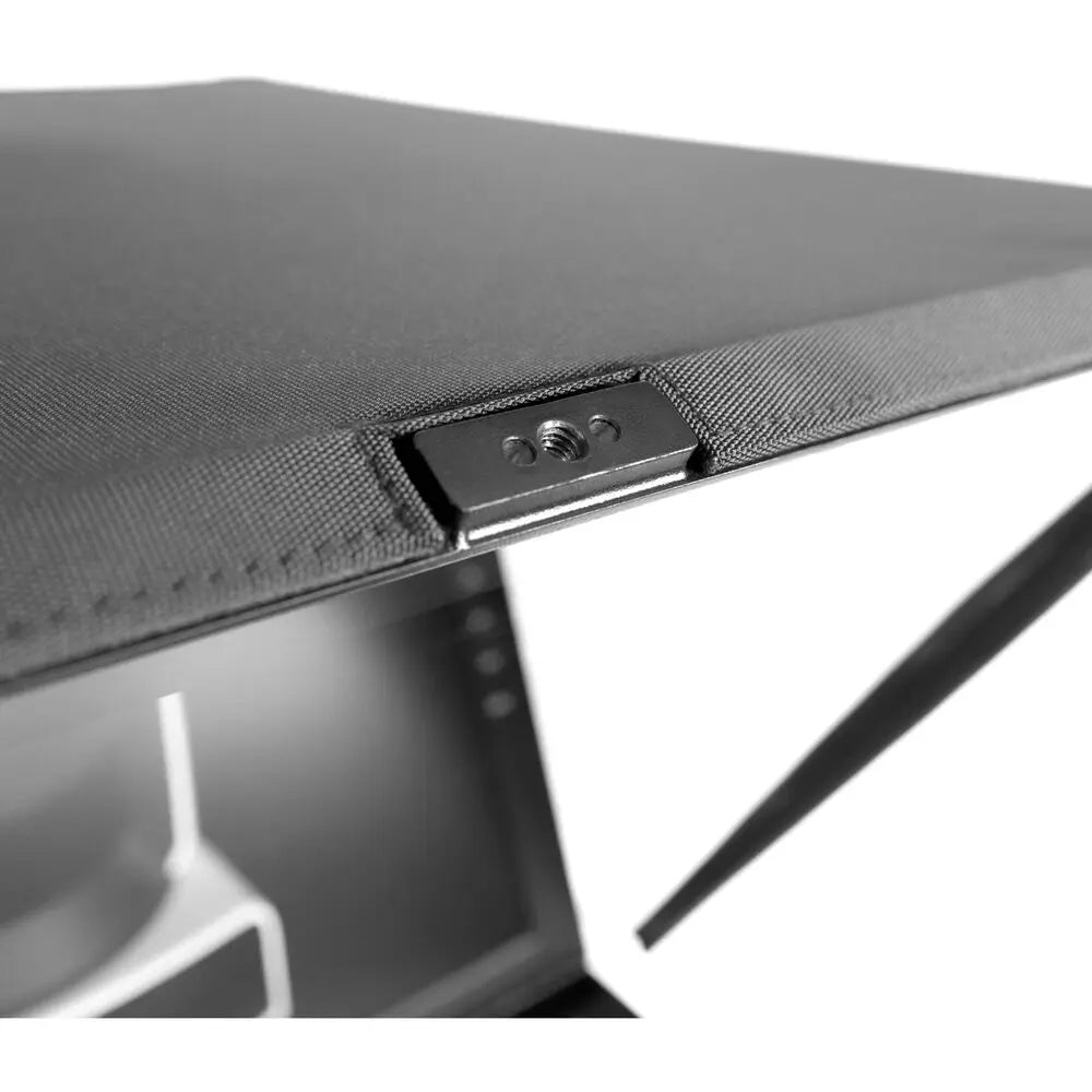 The upgraded teleprompter base includes a rail to slide the entire rig forwards or backwards. This makes balancing more intuitive and does not require counterweights.