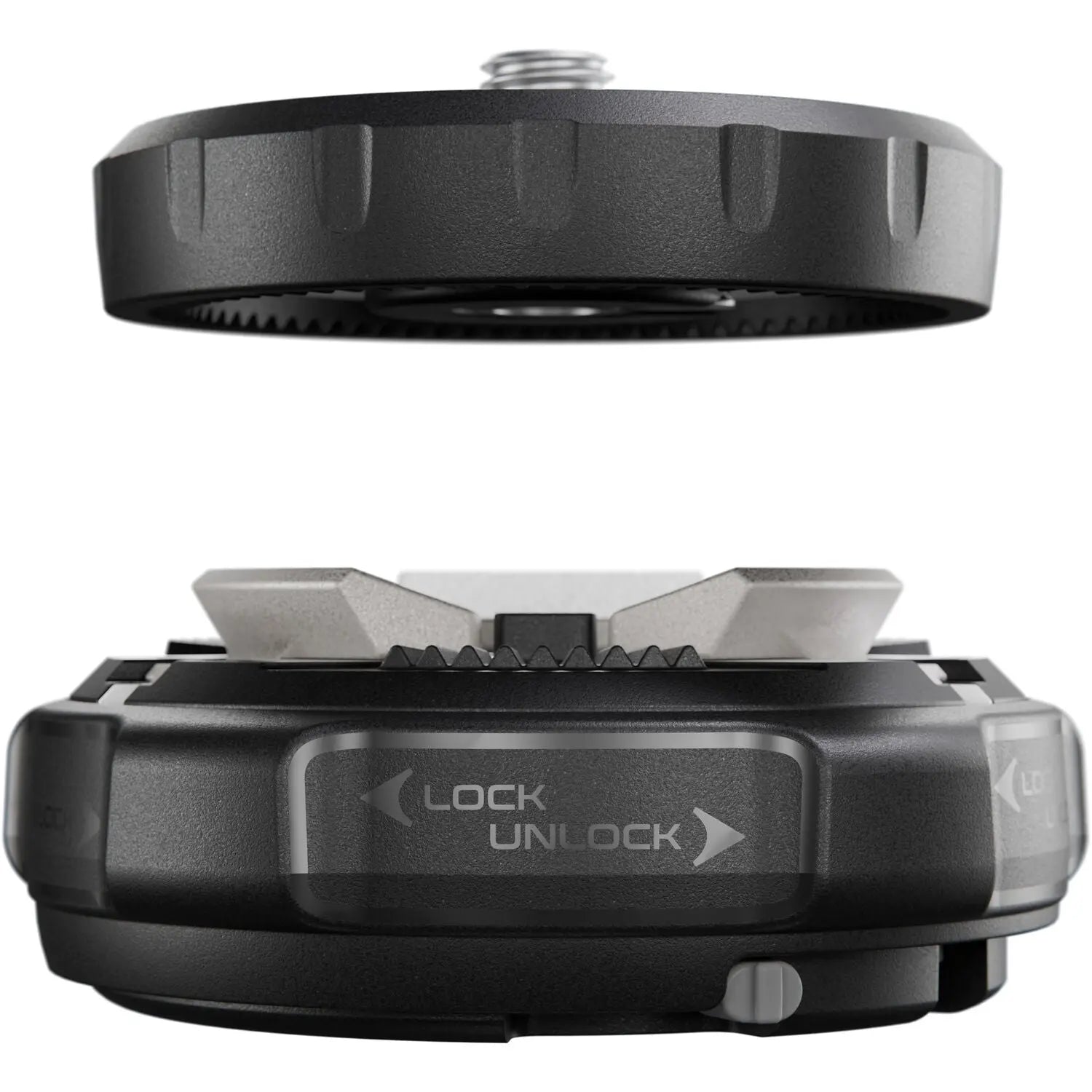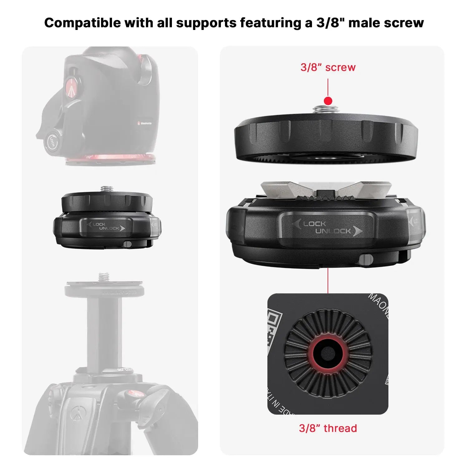 The flat base mount features a standard 3/8"-16 thread, while the top plate includes a matching 3/8"-16 attachment screw. The plate drops easily into place and allows full 360° rotation, making repositioning quick and intuitive. Integrated anti-rotation teeth help secure mounted heads or accessories, preventing unwanted loosening during use.