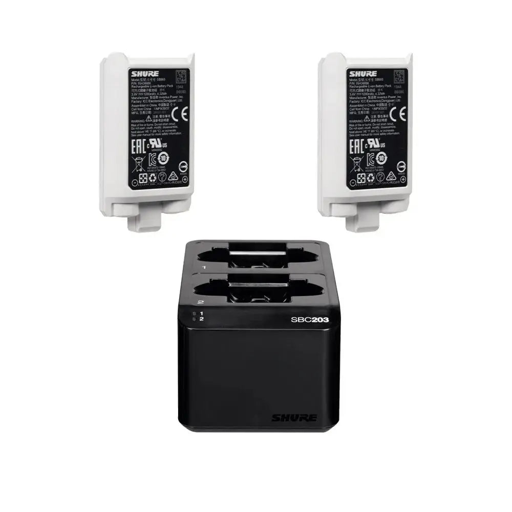 The Shure SBC203 Dual-Docking Recharging Station + 2x SB903 Rechargeable Battery for SLX-D Transmitter Set is a battery and charger set that features two SB903 batteries, and a SBC203 charger.
