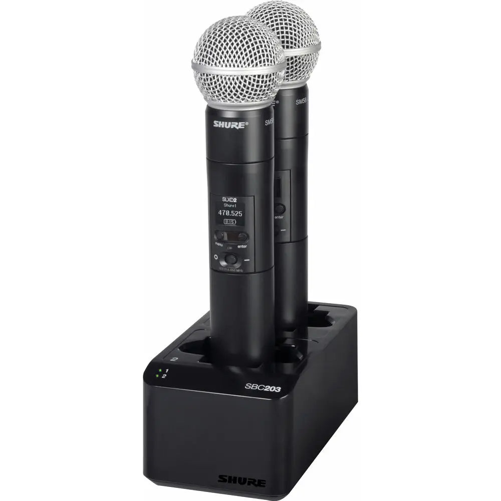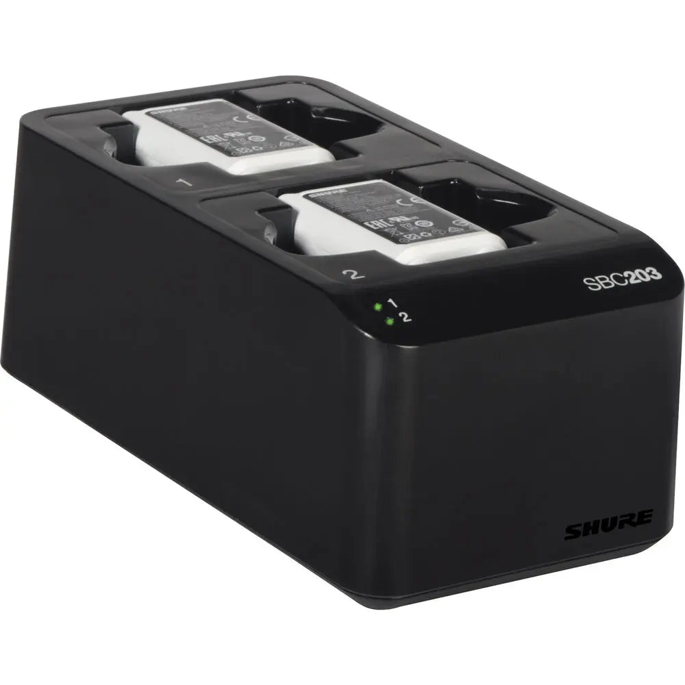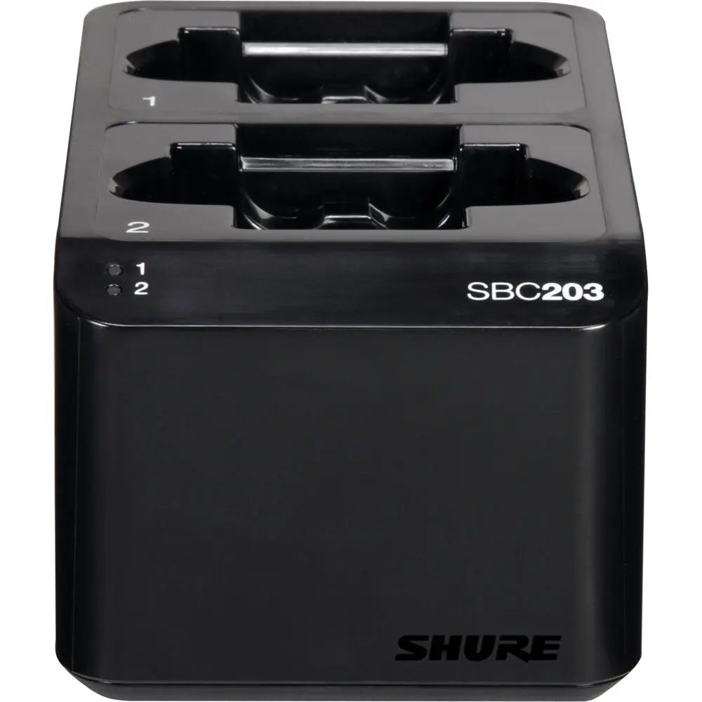 The Shure SBC203 is a dual-docking recharging station capable of recharging two SB903 lithium-ion batteries in or out of their transmitters. The SBC203 is built to charge two batteries, two bodypack transmitters, two handheld transmitters, or any pairing of two SLX-D Series transmitters and SB903 batteries.