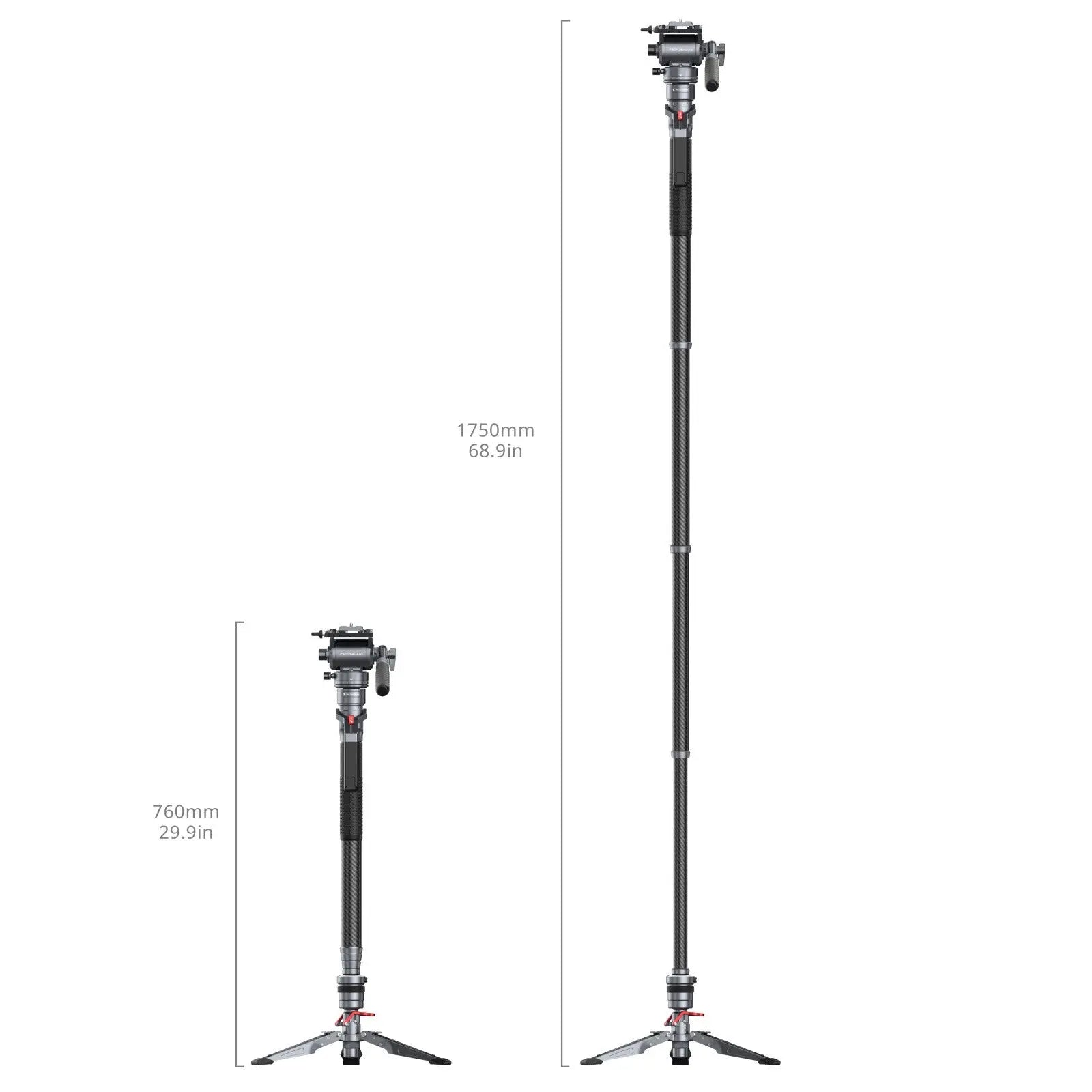 The SmallRig Carbon Fiber Video Monopod 5565 provides stable support for photographers and videographers working in tight spaces or on the move. The top features a 1/4"-20 screw for camera mounting and accessory expansion, while the base includes dual 1/4"-20 and 3/8"-16 screws, ensuring broad compatibility with a variety of photography and videography equipment. It extends to a maximum working height of 1750mm / 68.9 in, yet collapses to 76cm / 29.9 in for convenient transport, weighing just 2500g / 5.51 lb. Additionally, three 1/4"-20 mounting holes allow for attachment of accessories such as magic arms for enhanced flexibility on set.