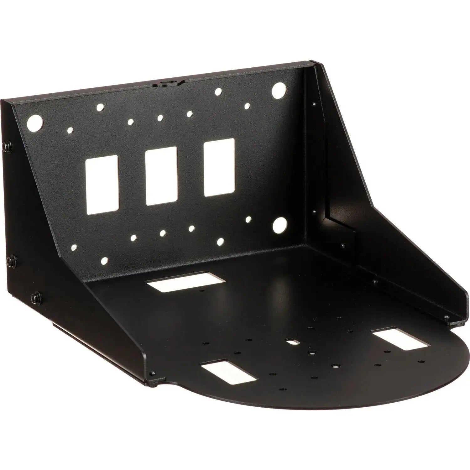 The black Canon Wall Mount Kit for CR-N500 Camera mounts your compatible CR-N300, CR-N500 or CR-N500 PTZ camera on a wall or surface for stable, permanent installation in a lecture hall, TV studio, or entertainment venue. The kit includes all the hardware required to secure both the camera and the camera's safety wire to the desired location. Durable steel construction allows for a maximum load capacity of 15.5 pounds. The bracket has a black powder coat finish and is RoHS standard compliant.
