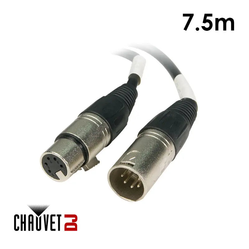 The CHAUVET DJ 5-Pin XLR DMX Lighting Cable (7.5m) features a 5-pin XLR male connector on one end and a 5-pin XLR female connector on the other end. The cable is 7.5m long and is designed specifically for lighting equipment.
