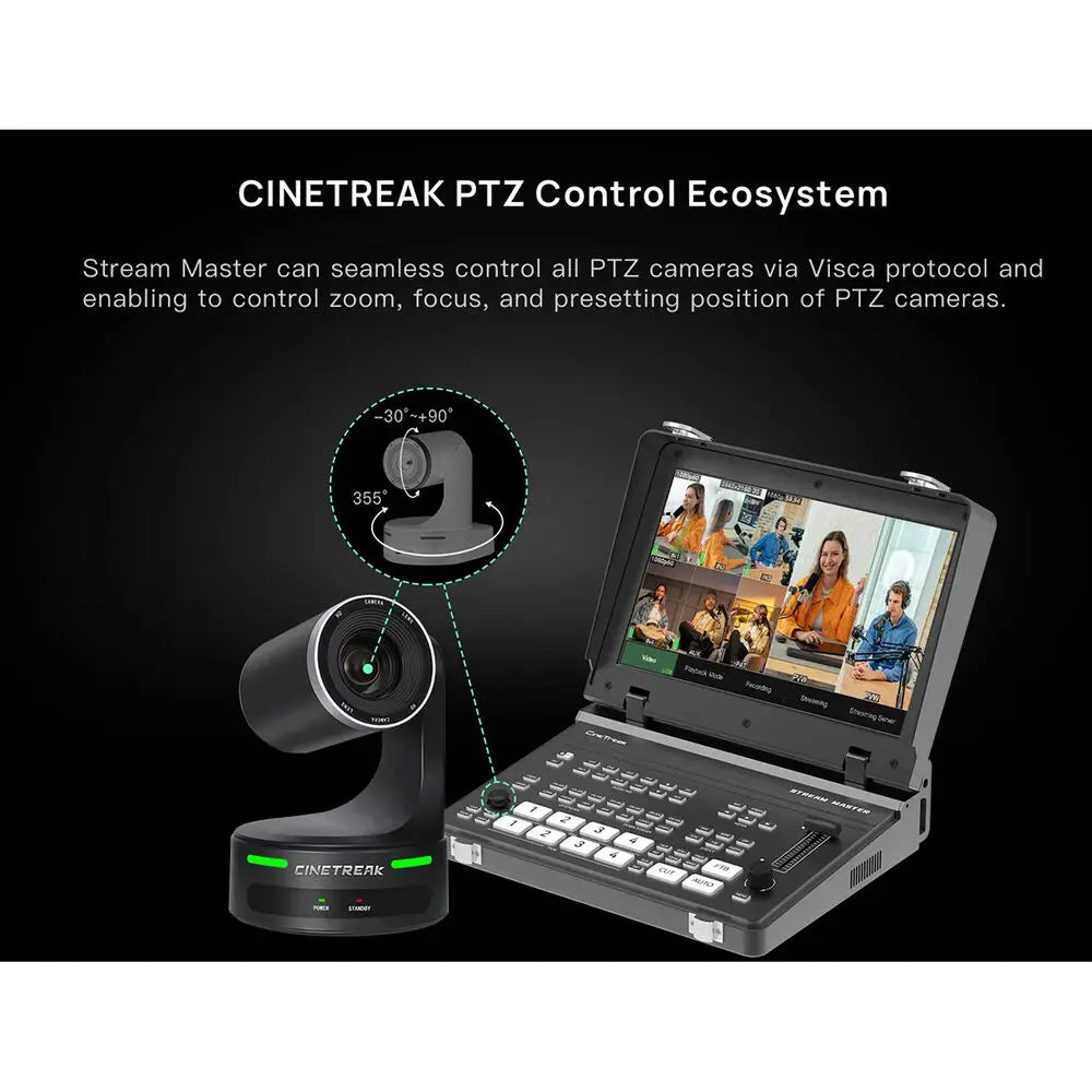 The CineTreak Stream Master SDI Video Switcher is a professional all-in-one solution designed for live production, streaming, and content creation. Ideal for broadcasters, educators, and live event producers, the Stream Master SDI features four HDMI inputs, four SDI inputs, one HDMI program output, and one SDI AUX output, allowing intuitive multicamera switching and flexible video management. Its downstreaming capabilities enable additional content integration from online streaming sources or an SD card, giving full control over your production workflow.