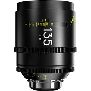 This 40mm prime lens has an aperture range of T1.4 to T22, offering excellent low-light capture and arrestingly shallow depth of field. A 16-blade iris and optical construction of multiple grouped elements provide a soft, natural bokeh to your high-quality imagery. The focus ring rotates 270°, and the iris ring 77° for intuitive manual adjustments.DZOFilm Arles 135mm T1.4 FF/VV Prime Cine Lens (PL Mount, Feet)