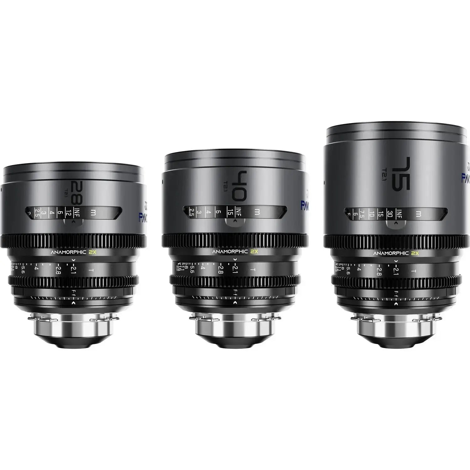 DZOFilm PAVO 2x Anamorphic 28/40/75mm T2.1 3-Lens Set (Blue Coating, PL/EF Mount, Feet)