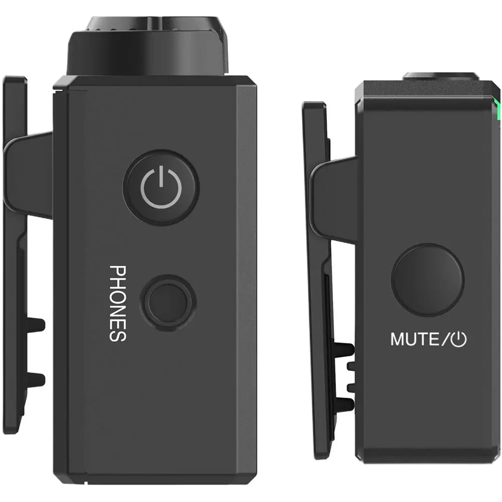 The receiver features a belt clip, OLED screen, and intuitive control knobs for volume, mute and mode settings. It includes a 3.5mm line output and a 3.5mm headphone output for real-time monitoring. The two-channel design supports an optional second transmitter (sold separately), allowing for two-person interviews or content creation with a single receiver. Audio can be transmitted with less than 5 milliseconds of latency at up to 100 metres of line-of-sight, and the receiver offers switchable mono, stereo, and safety output modes for different workflows.