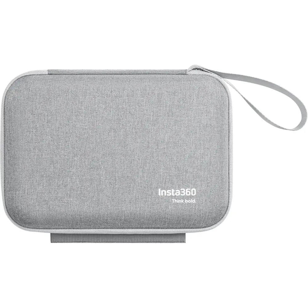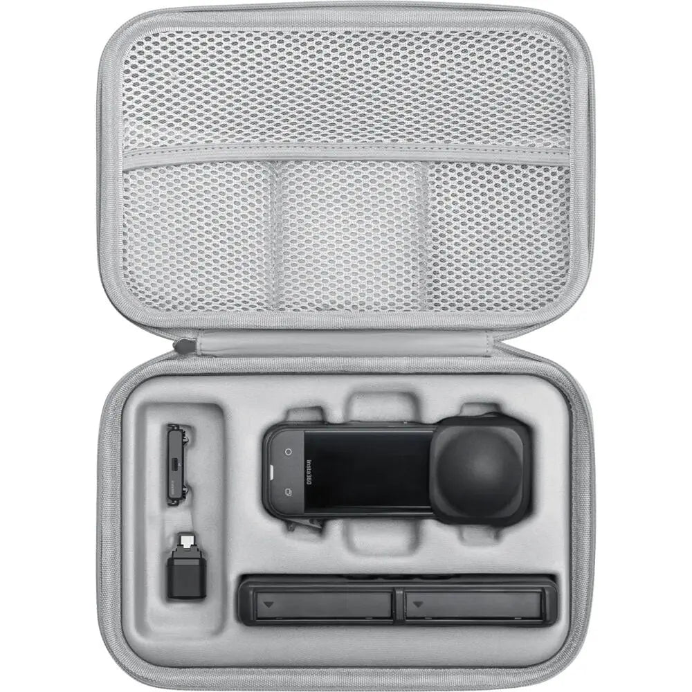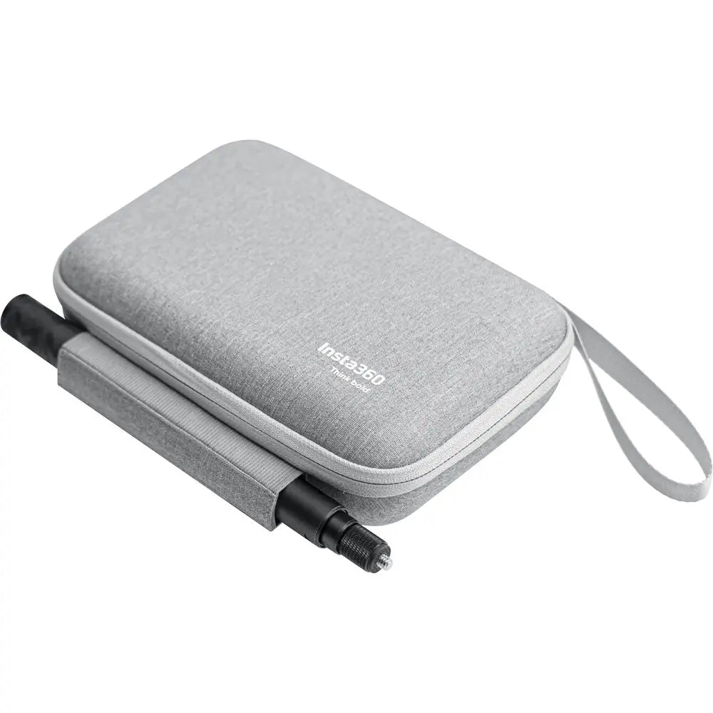The Insta360 Carry Case for X5 from Insta360 is a compact case that fits the X5, spare batteries, fast charging case, cables, quick release mount, quick reader, and a 70cm, 85cm, or 114cm selfie stick in the external side sleeve. Its soft fabric exterior keeps it lightweight and stylish, and it closes with a single zipper. A mesh pocket inside the lid can store additional accessories like spare batteries and cables. There's a built-in fabric wrist strap on the exterior.