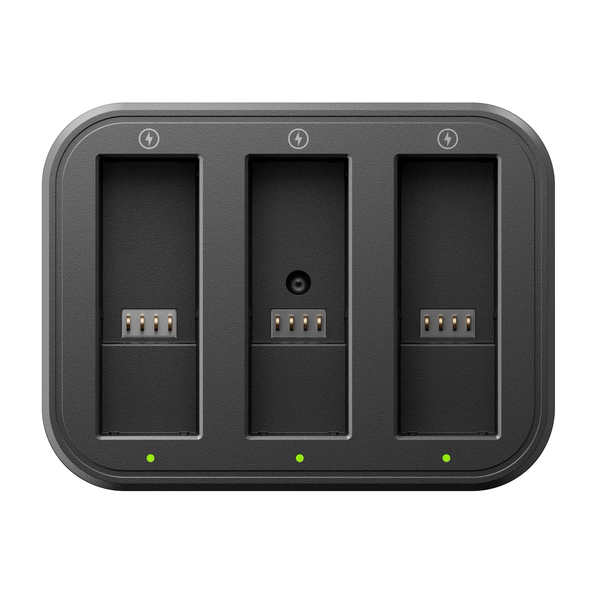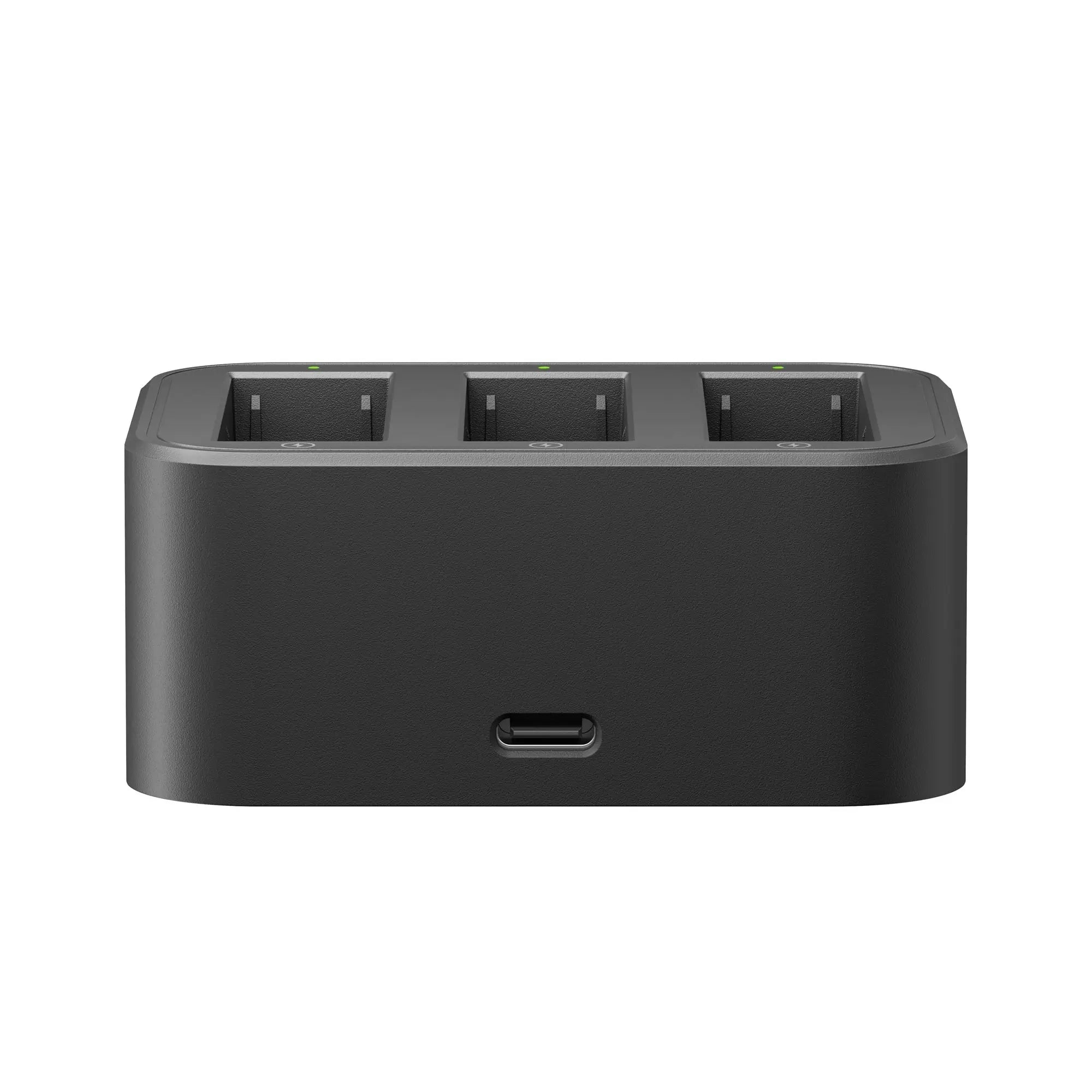 Recharge up to three batteries for your ACE PRO or ACE PRO 2 camera using this Fast Charge Hub from Insta360. The hub can charge three batteries simultaneously and has a total charge time of 53 minutes. LED indicators display the status of each battery slot for easy monitoring. Use the included USB-C cable to connect the hub to a power source of your choice.