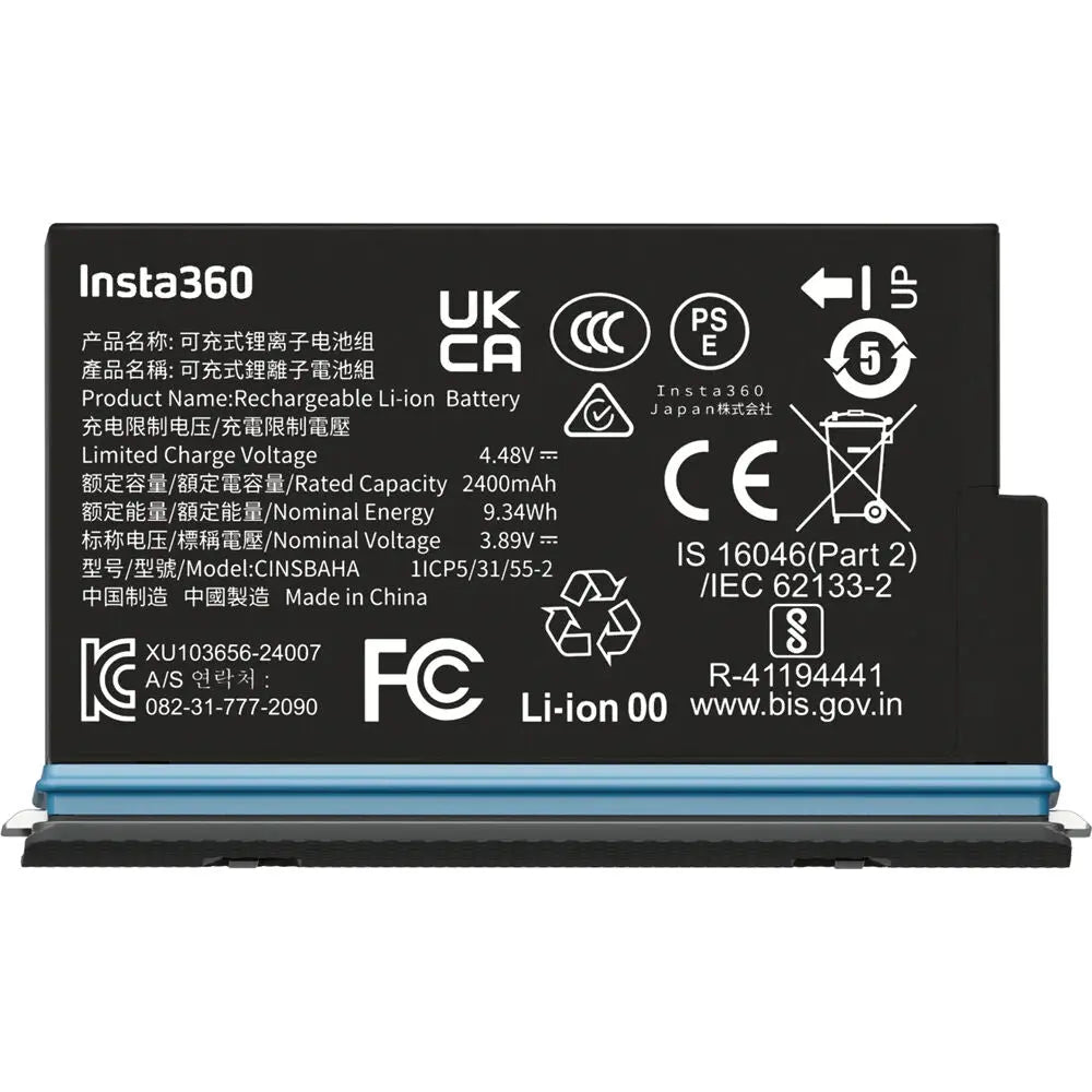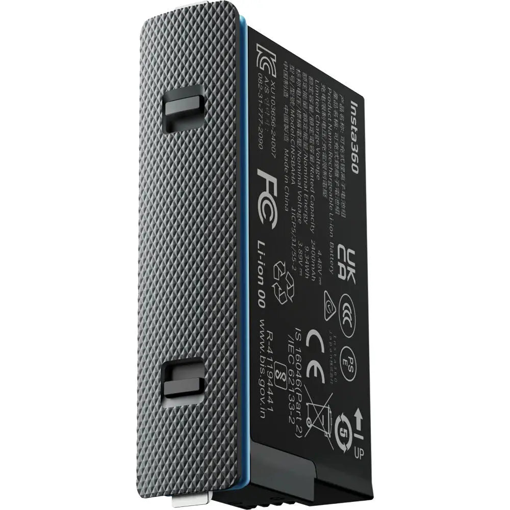 Power your X5 360° 8K action camera with the Insta360 Rechargeable Battery for X5 Camera (2400mAh) from Insta360. With an increased capacity and a total of 2400mAh, this battery ensures you can capture all the action for up to 135 minutes. Its lithium-ion chemistry can be recharged in a short duration for continued use, and it performs at full capacity even when in freezing temperatures down to -4°F. An included case protects the battery when it's not in use and features two convenient SD card storage slots.
