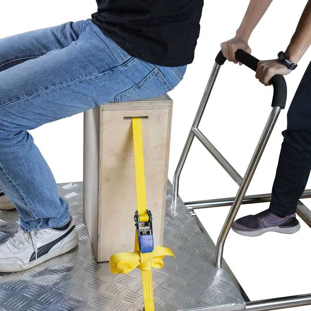 In addition, a slot design on both sides of the 8” full Apple Box allows you to fix the Apple Box onto a dolly with the ratchet strap for camera mounting or a seat for a cameraman.
