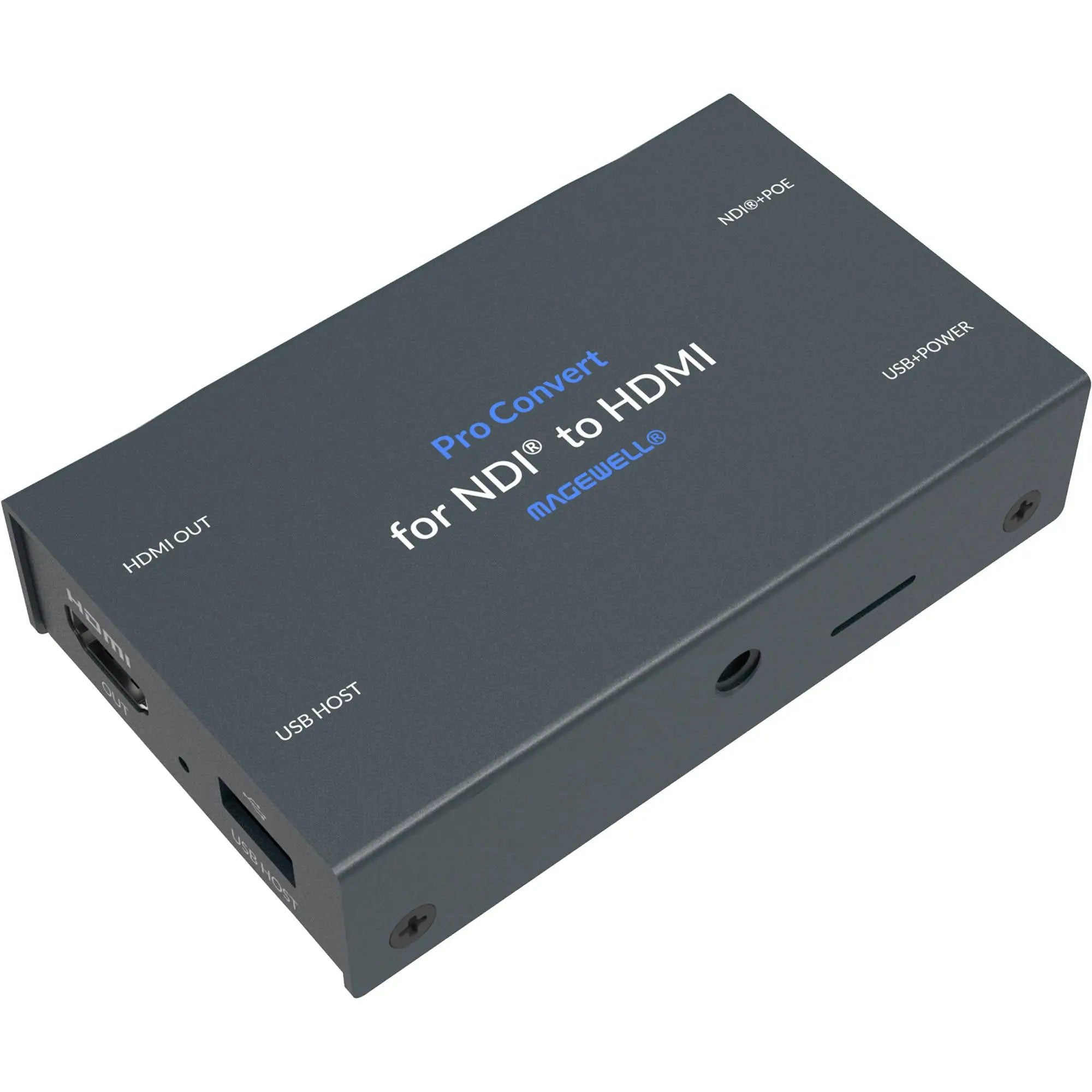 The Magewell NDI to HDMI converter is a compact, professional-grade solution for bringing high-quality NDI network video streams directly to HDMI displays, projectors, or production equipment. Designed for smooth integration into IP-based workflows, it supports formats up to DCI 4K at 60 fps on input and outputs up to DCI 2K at 60 fps or DCI 4K at 15 fps via HDMI 2.0.