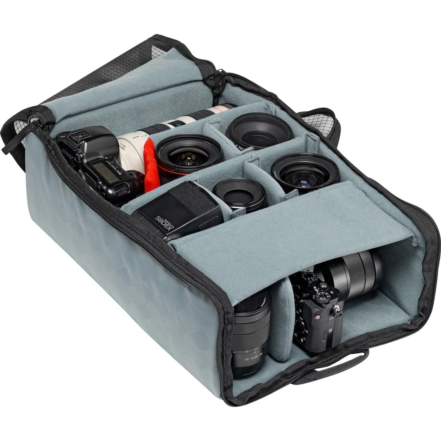 - Holds a DSLR with 70-200mm f/2.8 lens attached, up to four additional lenses, and a flash