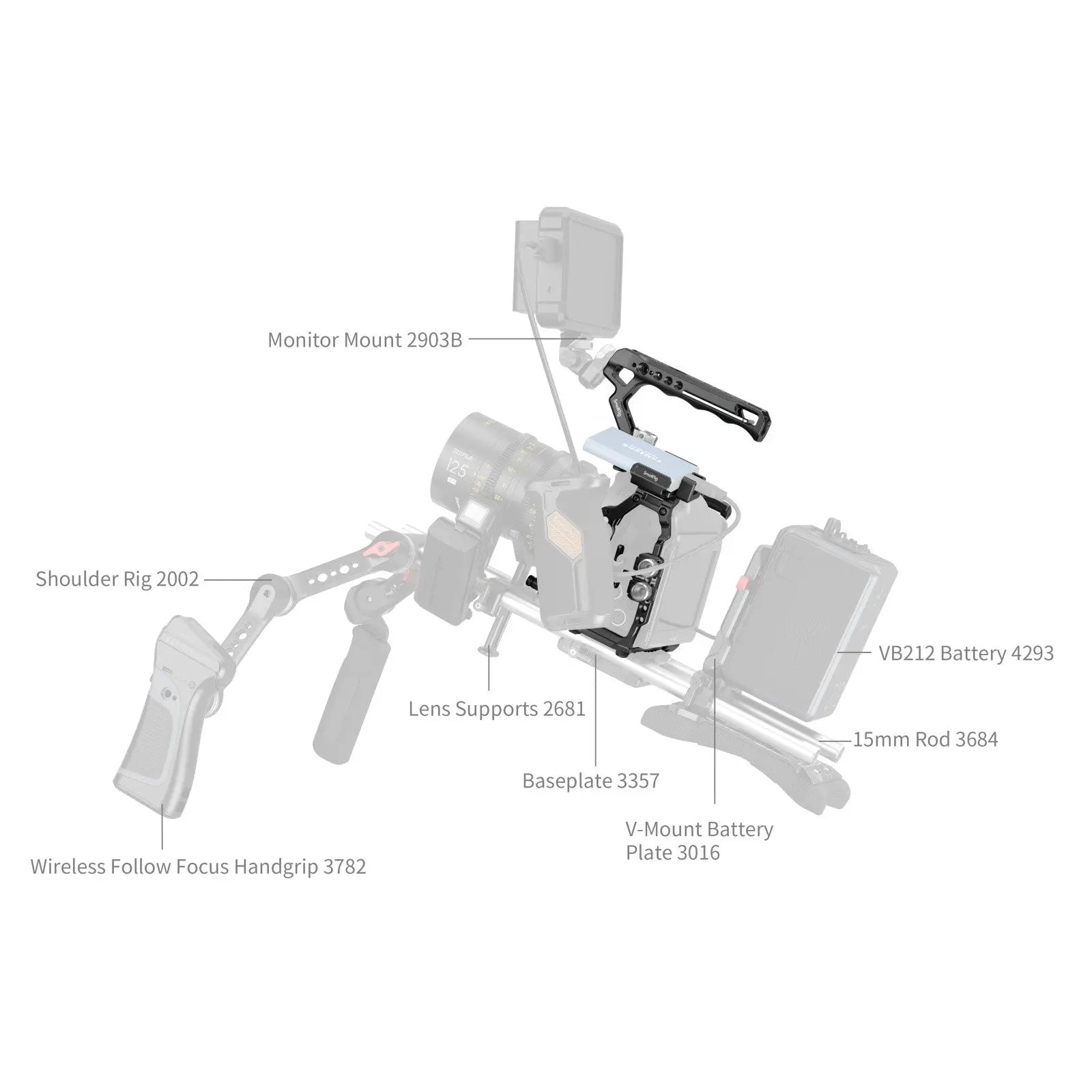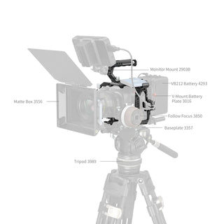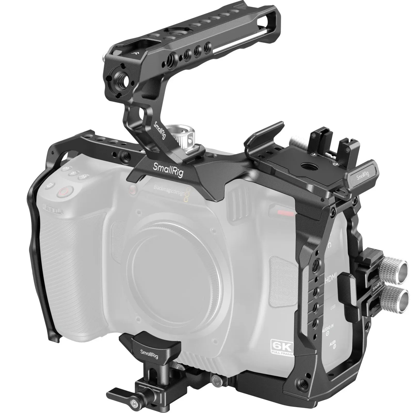SmallRig Basic Cage Kit for Blackmagic Design Cinema Camera 6K 4574 is designed to provide creators with a comfortable low-angle shooting experience, protect the camera, and offer multiple accessory expansion options. The kit includes a cage, a top handle, an HDMI & USB-C cable clamp, an SSD mount bracket, and a lens adapter support.