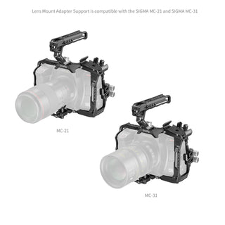 Three-point locking system secures the camera via two 1/4"-20 screws at the base and a 1/4"-20 screw on the top, while integrated silicone pads prevent scratching. The cage provides unobstructed access to all camera interfaces, card slots, the flip screen, and the battery compartment. The lens adapter support is compatible with Sigma MC-31, Sigma MC-21, and similar lens adapters, preventing the camera's mount from damage.